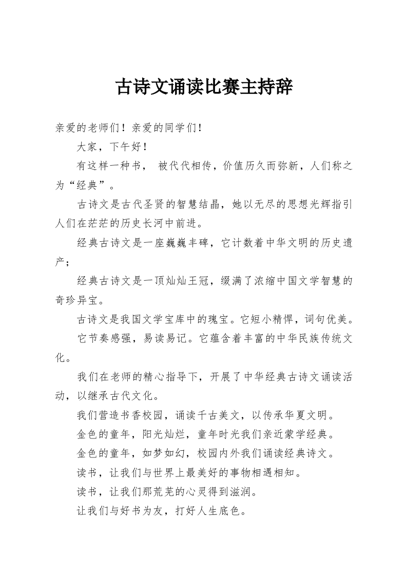 古诗文诵读比赛主持辞亲爱的老师们!亲爱的同学们!大家,下午好!有这样一种书,被代代相传,价值历久而弥新,人们称之为“经典”。古诗文是古代圣贤的智慧结晶,她以无尽的思想光辉指引人们在茫茫的历史长河中前进。经典古诗文是一座巍巍丰碑,它计数着中华文明的历史遗产;经典古诗文是一顶灿灿王冠,缀满了浓缩中国文学智慧的奇珍异宝。古诗文是我国文学宝库中的瑰宝。它短小精悍,词句优美。它节奏感强,易读易记。它蕴含着丰富的中华民族传统文化。我们在老师的精心指导下,开展了中华经典古诗文诵读活动,以继承古代文化。我们营造书香校园,诵读千古美文,以传承华夏文明。金色的童年,阳光灿烂,童年时光我们亲近蒙学经典。金色的童年,如梦如幻,校园内外我们诵读经典诗文。读书,让我们与世界上最美好的事物相遇相知。读书,让我们那荒芜的心灵得到滋润。让我们与好书为友,打好人生底色。