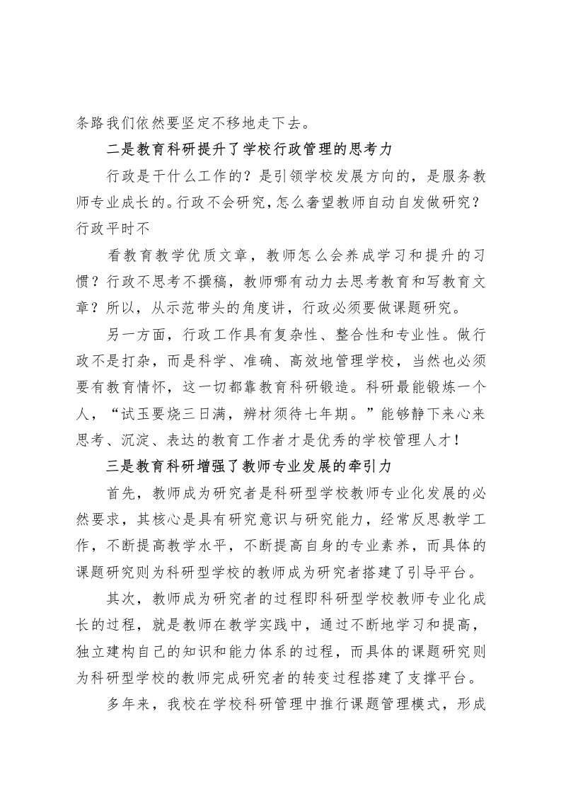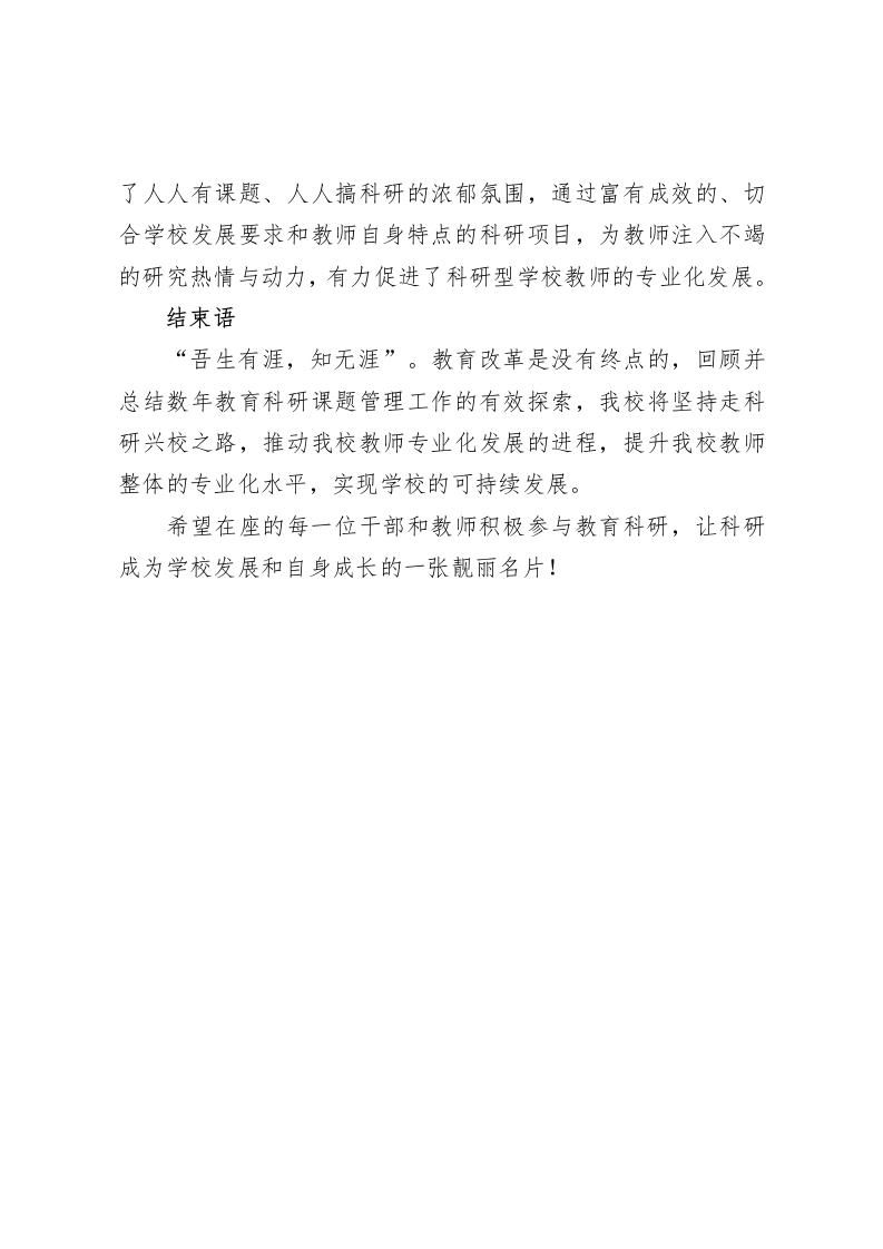 鼓励全校教师做教育科研,校长讲话研究能够推动学校发展和教师成长各位老师:有一句话是这样说的“如果你要成为一个优秀的人,就要去做那些有一定难度的事情。”学校里什么工作难度大?我认为让教师做教育研究,从事课题研究是难度最大的事情,因为这需要持续不断的学习、思考、实践和创新。“雕琢文章字字精,我因此事倍伤情”多年的教育科研工作历程,让我深感写科研计划,科研总结,科研汇报,科研成果报告的不容易。但我依然相信,研究能够推动学校发展和教师成长。为什么我们要做研究,回顾我校的发展和我个人的成长,我对于教育科研有三点深刻的体会:一是教育科研增强了学校内涵发展的驱动力上世纪八十年代,我校开始走出了一条科研兴校之路,我们用课题研究的形式驱动课堂变革,课程转型,不仅仅荣获教学成果政府奖,更重要的是树立了学校在教育系统里的品牌。同行看学校有一个重要的指标,就是内涵发展。什么是学校内涵发展?能不能抓住教育的规律和本质就是内涵发展,能不能在实践中破解棘手的教育教学问题就是内涵发展,能不能让师生保持生生不息的活力动力就是内涵发展!科研型学校的成功探索有力推动了学校的可持续发展。这