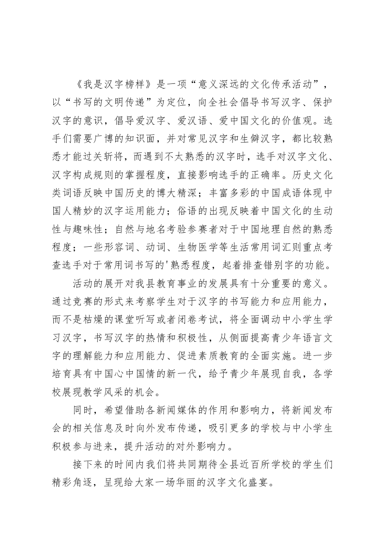 汉字书写竞赛活动,校长精彩致辞尊敬的各位领导、各位嘉宾、媒体朋友们:大家上午好!汉字是世界上最古老的文字之一,包含着丰富的文化内涵和审美意蕴,是我们民族祖先智慧的结晶,是中华文明最灿烂的瑰宝之一,是中华民族的魂之所在。中华民族辉煌灿烂的古代文明正是通过汉字的记载而流传下来,得到继承和发展,可以说没有汉字就没有中华民族。而近年来,随着电脑技术的发展和生活节奏的加快,“提笔忘字”和不规范使用汉字成为了一种常态,并且有向低龄化方向发展的趋势。许多中小学生因为长期使用电脑,只能大致记住汉字的形状,却无法正确写出具体部首和结构,频频出现错别字。如果国家未来的新一代汉字书写能力持续普遍下降,文明传承的品质将会受到严重缺损。汉字和悠久的汉字文化生存状态岌岌可危,正是在这种情况下,有必要举办一场文化活动,来向全社会倡导热爱汉字,保护汉字的意识,我是汉字榜样应运而生。它不仅仅是一场单纯的赛事,更是一个文化交流的平台。我们希望通过这个平台,通过解读汉字背后蕴藏的历史与文化,在中小学生中营造良好的学习氛围,体现汉字之美、传承中华文化,重新唤起大众对汉语的热情。同时构建和谐的社会文化氛围,丰富市民生活,建设文化XX,魅力XX,争取将活动打造成为一张令人瞩目的“城市名片”。