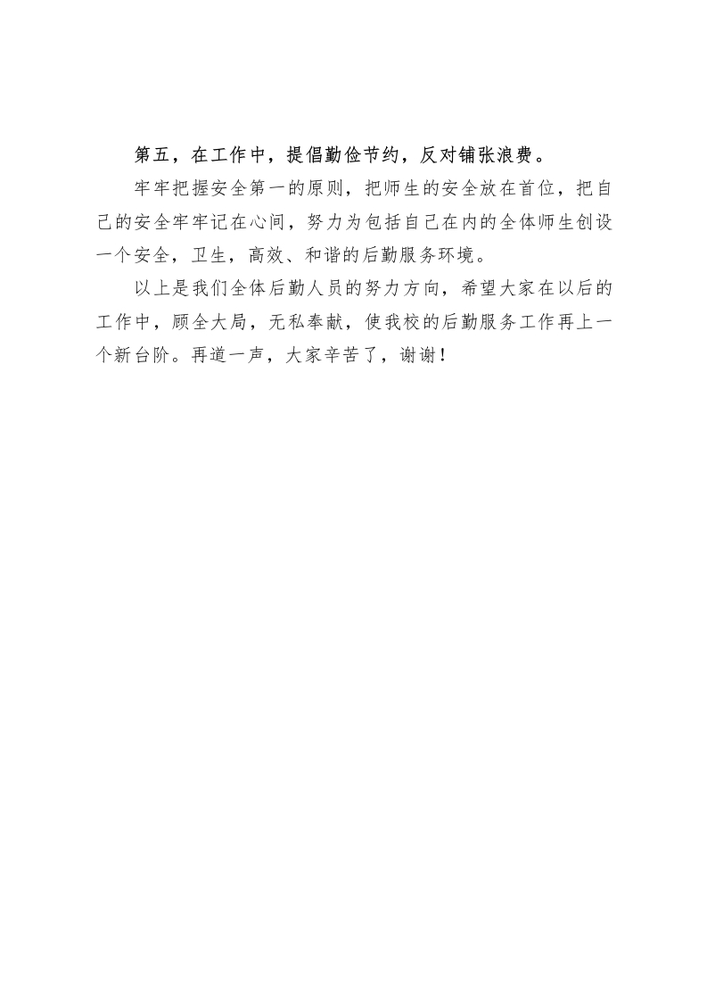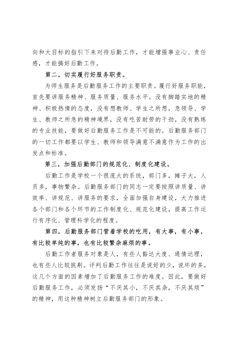 后勤工作例会,校长讲话要把后勤工作做得井井有条,有深度,有水平各位教职工:后勤服务工作是一项十分光荣、十分重要的工作,搞好后勤工作是我们做好一切工作的基本保障。后勤工作部门就是直接为吃穿住行创造条件、提供服务。实践表明,任何一个部门和单位,后勤工作搞不好,必然影响全面工作,做好后勤工作是做好全局工作的基础和条件。做好后勤工作可不是一件容易的事,需要有全心全意为师生服务的思想境界,满腔热情的服务态度,甘当无名英雄的奉献精神,还必须讲究科学,深谙业务。有些人认为后勤工作是一些很琐碎的事情,没有多大学问,其实不然。后勤工作是一门科学,是一个系统工程,有很多学问。要把后勤工作做得井井有条,有深度,有水平,需要下很大的工夫。这里我简要提几点要求,供大家参照执行:第一,把握大局。使后勤工作更好地服从和服务于学校工作全的服务部门,虽然工作很琐碎繁杂,但与整个学校的工作中心、工作大局密切关联,后勤工作的服务质量和水平如何,直接关系到学校作用的发展。这就要求后勤工作者要了解工作全局,自觉地使自己的工作服务于和服从于中心和大局。所以,从事后勤工作的同志,要把握大局,把握形势,只有站在全局的高度,在大方