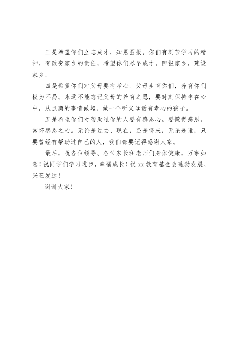 基金会奖学金发放仪式上,校长发表讲话,并对同学们提出5点希望尊敬的各位领导、老师们、同学们:大家下午好!在这阳光明媚、放飞理想、收获希望的美好时节,我们在此隆重举行20xx-20xx学年度xx教育基金会奖学金发放仪式。给30名获奖的学生发放6000元的奖学金和获奖证书。这既是xx教育基金会对xx小学的支持,对同学们的关怀,也是对同学们的鞭策和鼓励。这是尊师重教、支持教育事业的大好事。让我们用最热烈的掌声感谢xx教育基金会的各位领导和全体成员。参加今天颁奖仪式的有xx县关心下一代协会、xx中心校等单位的领导和获奖学生家长,让我们用热烈的掌声欢迎各位领导和家长的到来。用热烈的掌声向辛勤工作、无私奉献的园丁表示最诚挚的谢意!用最热烈的掌声向在语数综合成绩及品德、美术、音乐、体育单项获奖的30位同学表示祝贺!在此我对同学们提出五点希望:一是希望获奖的同学不忘Xx基金会及所有关爱你的人,继续进步,珍惜学习机会,并以此回报社会,立志创造美好的未来。二是希望你们刻苦学习,在学习生活中以乐观向上的精神风貌克服困难,学好科学文化知识,掌握过硬的本领。