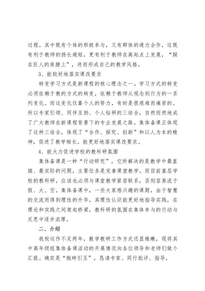 集体备课经验交流分享,校长汇报营造研讨氛围,丰富教学内涵各位领导、同仁:感谢xx给我这个机会,能站在这里向大家分享交流xx学校集体备课方面的话题,今天我汇报的主题是营造研讨氛围,丰富教学内涵。一、前言我们说,提倡集体备课,其目的不是为了追求形式,而是为了追求效果。因为集体备课至少有以下几点主要好处:1、能显著提高教育教学效果面对新课程,不少人不是缺少先进的理念,而是缺少理念与实践有机结合的能力与机智。如何理解新课程、把握新教材、实施新教法,心中常感惴惴,仅靠个人孤军奋战冥思苦想,显然不可取。一位名人说过,你有一个苹果,我有一个苹果,交换后每人还是一个苹果;你有一种思想,我有一种思想,交换后每人有两种思想。集体备课,可以引发参与者智慧的碰撞,可以长善救失,取长补短,明显提高教育教学效果。对于师资比较薄弱的学校而言,其效果更为显著。2、能不断提高教师整体的教学水平集体备课是对教学工作进行全程优化的校本教研活动,使教师在教学的认知、行为上向科学合理的方向转化。自我钻研、集体研讨、分工主备、教后反思的过程,就是教师专业发展的