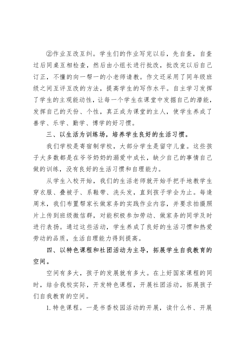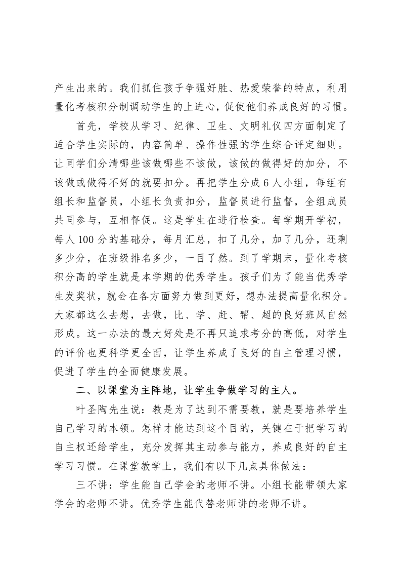 寄宿制学校校长在论坛发言培养自主管理习惯,促进学生自我成长尊敬的各位领导、校长朋友们:大家好!我是Xx学校的校长Xx。Xx学校位于Xx乡,创办于20xx年,是一所民办寄宿制小学,现有xx个教学班,在校生Xxx人,教职工X余人。今天我汇报的主题是:培养自主管理习惯,促进学生自我成长。Xx学校的办学宗旨是创办农村优质学校,让农村孩子享受优质教育。优质不仅仅指条件优、成绩优,还包含对学生道德品质的培养和良好习惯的养成。为了培养学生的自主管理能力,我校为学生创造各种平台和机会,使每一个学生能够得到锻炼,实现自我管理和自我教育。接下来,我从以下四个方面向大家汇报我校学生自主管理的一些具体做法。一、以学生为主体,让学生做好自管自律。学生会、班级岗位负责制、学生个人量化考核积分制是我们在学生自管自律方面采用的方法。对学生会和班级岗位负责制大家都很了解,也有很多学校在用,今天我就不再详说。我想重点说一下我校的学生个人量化考核积分制。到了学期末,每个学校都会评选优秀学生,小学的优秀学生大部分都是老师定的。我们学校的优秀学生不是班主任选的,也不是同学们投票选的,是通过每班的《学生量化考核积分表》