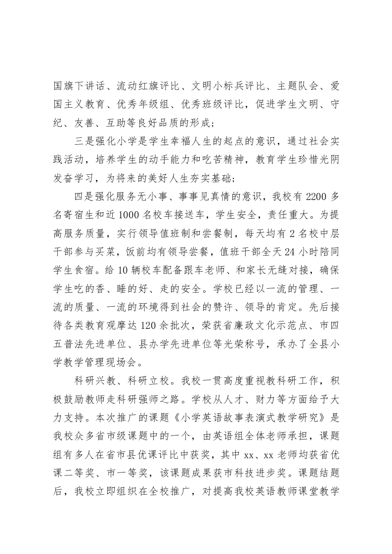 教科研推广会在学校举行,校长致辞,最后预祝本次教科研推广会圆满成功!尊敬的市教研室张主任、县教育局李局长、各位领导、各位专家、各位老师:我们迎来了全市教科研成果推广会在我校的隆重召开,我谨代表xx县第一实验小学4300余名教职工对各位领导、各位专家、各位老师光临我校指导工作表示热烈的欢迎!xx县第一实验小学创办于20xx年,学校占地150亩,总建筑面积5.7万平方米,现有75个教学班,近4200名学生,其中2200名寄宿生,179名教职工。自创办以来,我校以人性化为学校管理核心理念,以制度化为学校管理基础,以细节化为学校管理抓手。在全体教职工中强化四个意识:一是强化提高教学质量的关键在课堂的意识,通过教师基本功达标考核、课堂水平达标验收、说上评课、青蓝工程等活动,提高教师课堂水平,从而促进教学质量的大面积提高,已拥有省特级教师1名、市名教师1名、市县学科带头人,骨干教师、教学能手、教坛新秀40余名,有150人次在全国省市县优课评比、基本功比赛中获奖,有300余篇教师论文在市级以上报刊发表或获奖,一支业务精良、素质过硬、精力充沛、事业心强的优秀教师群体已经形成;二是强化养成教育的关键在平时的意识,通过升旗仪式、
