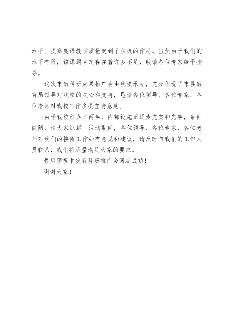 教科研推广会在学校举行,校长致辞,最后预祝本次教科研推广会圆满成功!此内容为付费资源,请付费后查看
