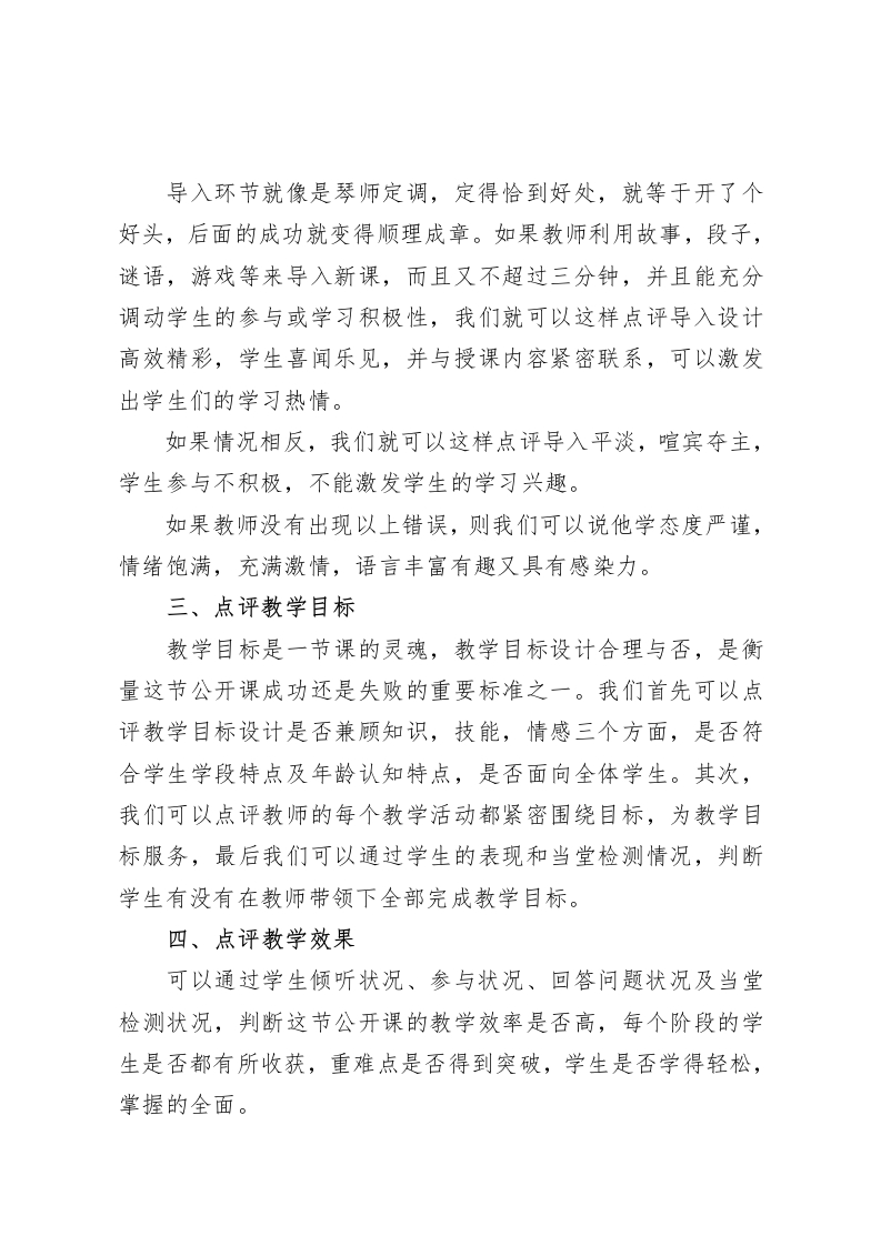 教师会议上,副校长讲话,围绕评课从6个方面展开阐述老师们:开学以来,各项工作已正常开展。听课评课活动应该进入正题了。在座的老师经历过无数的公开课、示范课、汇报课,我想大部分老师不怕听课也不怕讲公开课,但最怕评课。那么多双同事的眼睛看着,耳朵听着,点评得不到位,没有深度会暴露出自己的肤浅来,可不点评又不行。今天的会议主题是如何点评公开课?点评同事们的公开课时,我们可以从教学态度、教学目标、导入环节、教学效果、教学活动设计、教学方法和手段等几个方面展开阐述,再用上下面这些专用的点评术语,相信在评课环节最出彩的人一定是你,而且这样点评还可以让讲课的同事心服口服。一、点评教学态度如果讲课老师在授课时出现明显的错误,例如写了错别字或计算错误,或者本课重难点都没有得到突破,课堂上因为对教材不太熟悉而很紧张,讲课丢三落四,一会儿讲后面的内容,一会儿又补充前面的内容,或者出现知识点遗漏,这些情况都说明教师的教学态度不够严谨,在备课上下的功夫不够深,准备不充分。二、点评导入环节