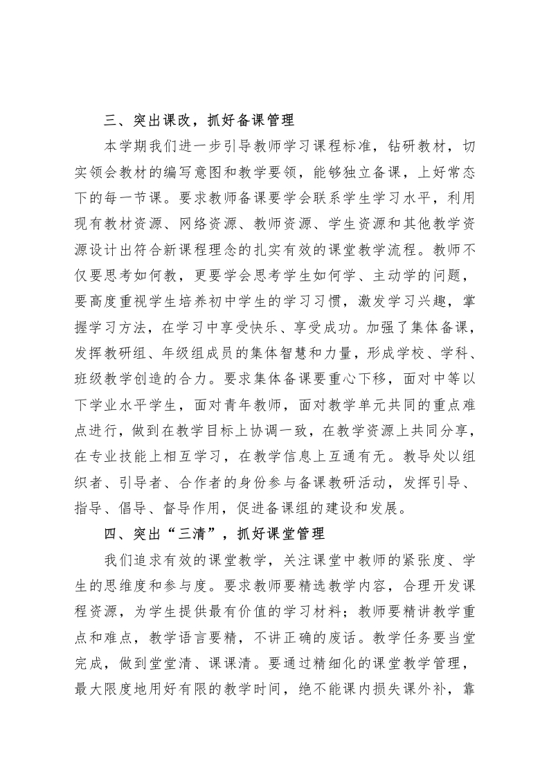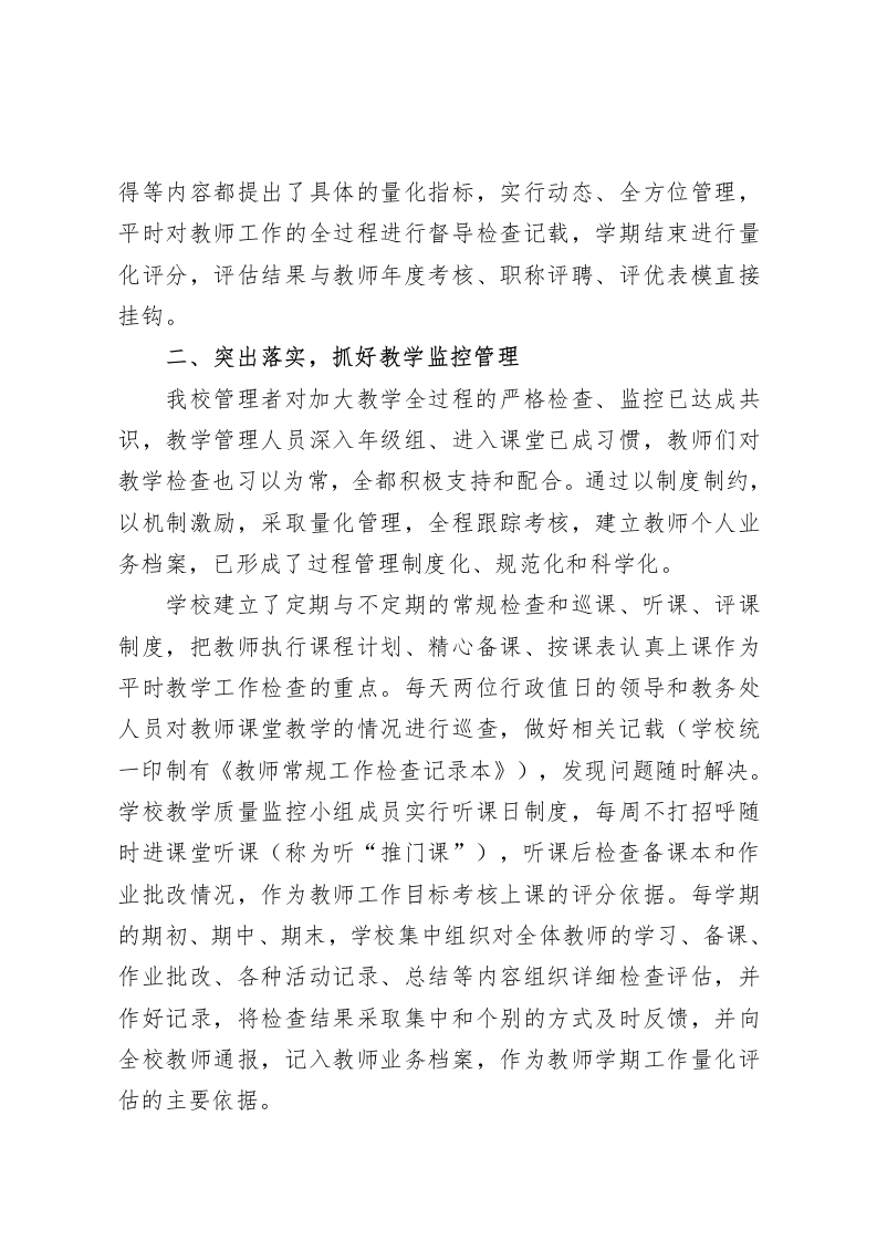 教学管理工作,副校长汇报实施教学精细化管理促进教学质量的全面提升各位领导、同仁:大家好!教学质量是一所学校的生命,教学常规管理是提高教学质量的基石。许多高质量学校的经验告诉我们:“细节决定成败”,“态度决定一切”,他们最成功也是最朴实的做法就是抓好常规,抓严细节,抓实过程。“一步一个脚印,步步走向高峰”。我们要把课程管理思想落到实处,同样要抓好教学管理的每个环节,每个过程,向管理的规范化精细化要效率。教学过程管理环节很多,因素复杂,针对我校教育教学工作的现状,我们在本学期主要抓好了以下几个重要环节和过程。一、突出完备,抓好教学制度管理要规范教师的教学行为,管理制度是保证。我校在认真贯彻《xx市中小学教学常规管理细则》的基础上,根据课改的要求,修订了《xx中学教学常规管理制度》,印发给每个教师,提醒老师们按常规要求施教。还配套制定了《xx中学教学常规管理实施细则》,对教学的备、教、辅、改、评、研等环节提出了具体的要求。同时出台了《xx中学专任教师工作目标考核量化评估方案》,对教师的政治学习、业务学习、教学计划的拟定、备课、上课、教研活动、作业批改、学生成绩考查、质量分析、总结的撰写、各种活动记录和表册的填写及成果的取