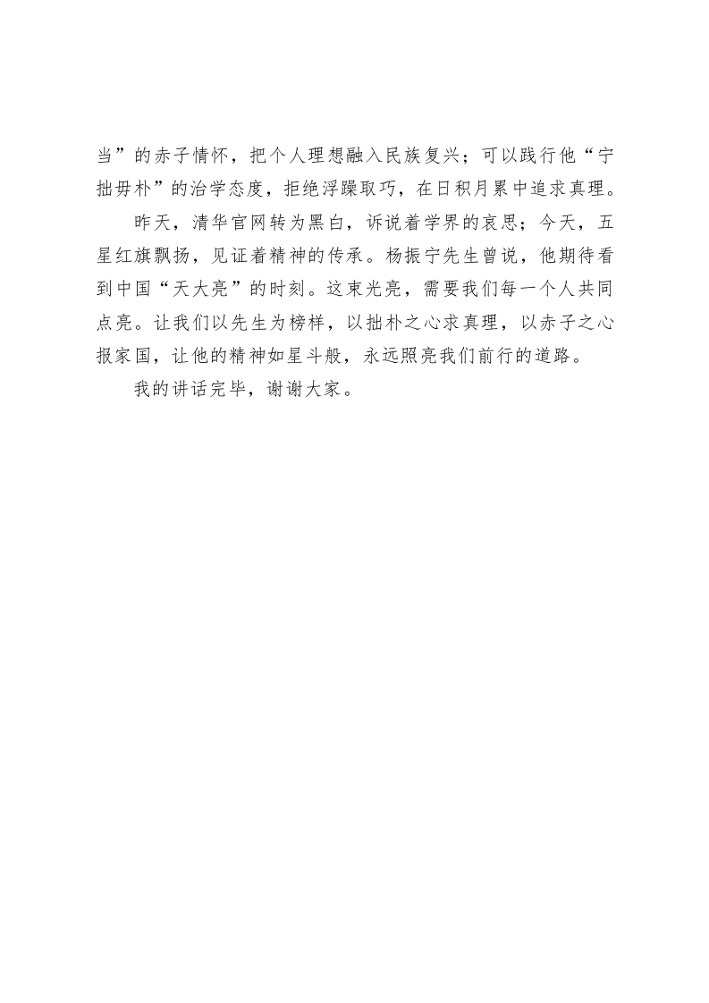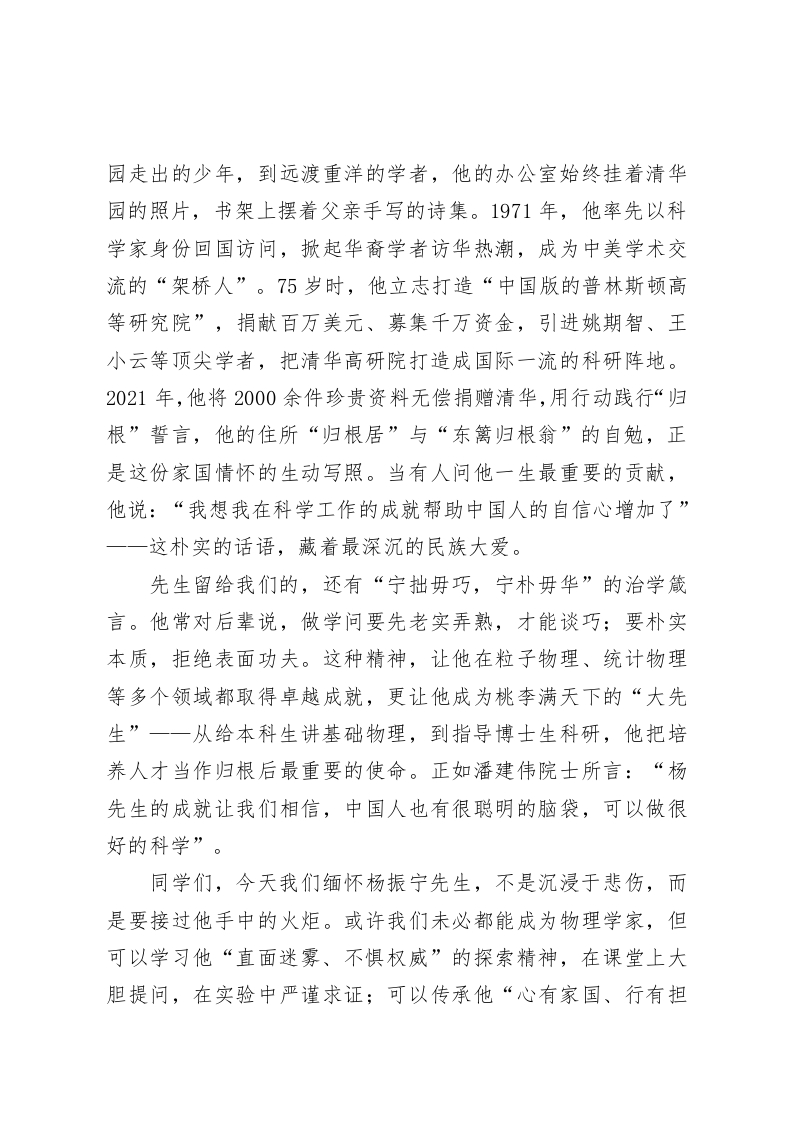 围绕杨振宁去世,校长在国旗下讲话:追思星斗之光,传承先生之志亲爱的老师们、同学们:大家早上好!今天,当五星红旗在校园上空冉冉升起,我们的心中涌动着格外沉重的敬意与缅怀。就在前天,一颗照亮现代物理学天空的巨星悄然陨落一一享誉世界的物理学家、诺贝尔奖获得者、清华大学教授杨振宁先生,因病在北京逝世,享年103岁。这位用一个世纪书写科学传奇与家国情怀的老者,终究归航于他毕生探索的星空。站在国旗下回望先生的一生,首先是一部攻坚克难的科学史诗。35岁时,他与李政道提出“弱相互作用中宇称不守恒”理论,如奥本海默所言,“为困在黑屋子里的高能物理学家找到了出口”,一举斩获诺贝尔奖,成为最早获此殊荣的中国人。而他与米尔斯提出的"杨-米尔斯规范场论“,更被视作与麦克斯韦方程、爱因斯坦广义相对论比肩的基础物理理论,直接催生了多个诺贝尔奖。这份成就的背后,是他敢于质疑权威的勇气一一面对”0-τ之谜"的学界困境,他顶住压力提出大胆假设,最终以实验验证改写人类对对称性的认知;是他毕生不辍的执着,百岁高龄仍对科学世界保持着孩童般的好奇,在讨论会中认真记录年轻人的发言,不懂就追着请教。更让我们动容的,是先生贯穿一生的家国赤子心。从清华