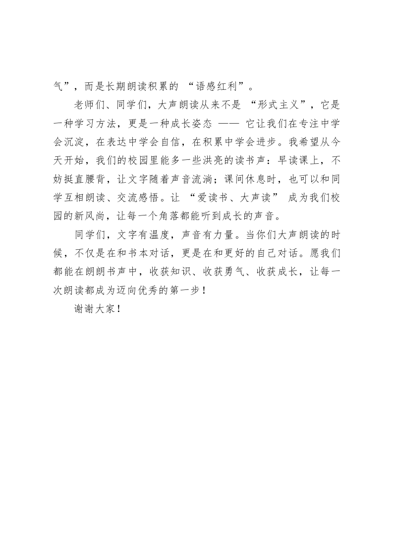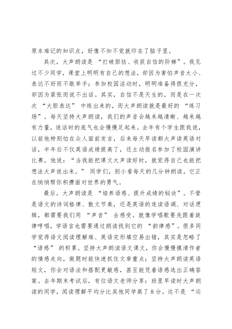 校长在国旗下讲话:在朗读中遇见更好的自己亲爱的老师们、同学们:大家早上好!当五星红旗迎着晨光冉冉升起,校园里的清风还带着书卷的墨香,我想和大家聊一个看似平常却藏着大道理的话题一一读书,为什么要大声读出来?每天清晨,我走过教学楼,总能听到不同班级传来的读书声:有的同学轻声默念,有的同学跟着领读员小声附和,也有的同学挺直腰背、声音洪亮地朗读。或许有同学会疑惑:只要把文字看懂了,小声读和大声读有区别吗?今天,我想和大家分享三个理由,让我们一起明白“大声朗读”背后的价值。首先,大声朗读是“唤醒记忆与理解的钥匙”。当我们大声读的时候,眼睛要专注地捕捉每一个文字,嘴巴要准确地发出每一个音节,耳朵还要认真倾听自己的声音一一这可不是简单的“多器官配合”,而是在为大脑搭建一条“多维记忆通道”。就像我们学《岳阳楼记》时,小声念可能只记住“先天下之忧而忧”的句子,但大声朗读时,“衔远山,吞长江”的壮阔画面会随着声音走进心里,文字里的情感和逻辑也会慢慢清晰。心理学上有个“多感官记忆原理”,说的就是多种感官联动能让记忆更牢固、理解更深刻。同学们不妨试试:明天早读时,把语文课文或英语短文大声读出来,你会发现,那些