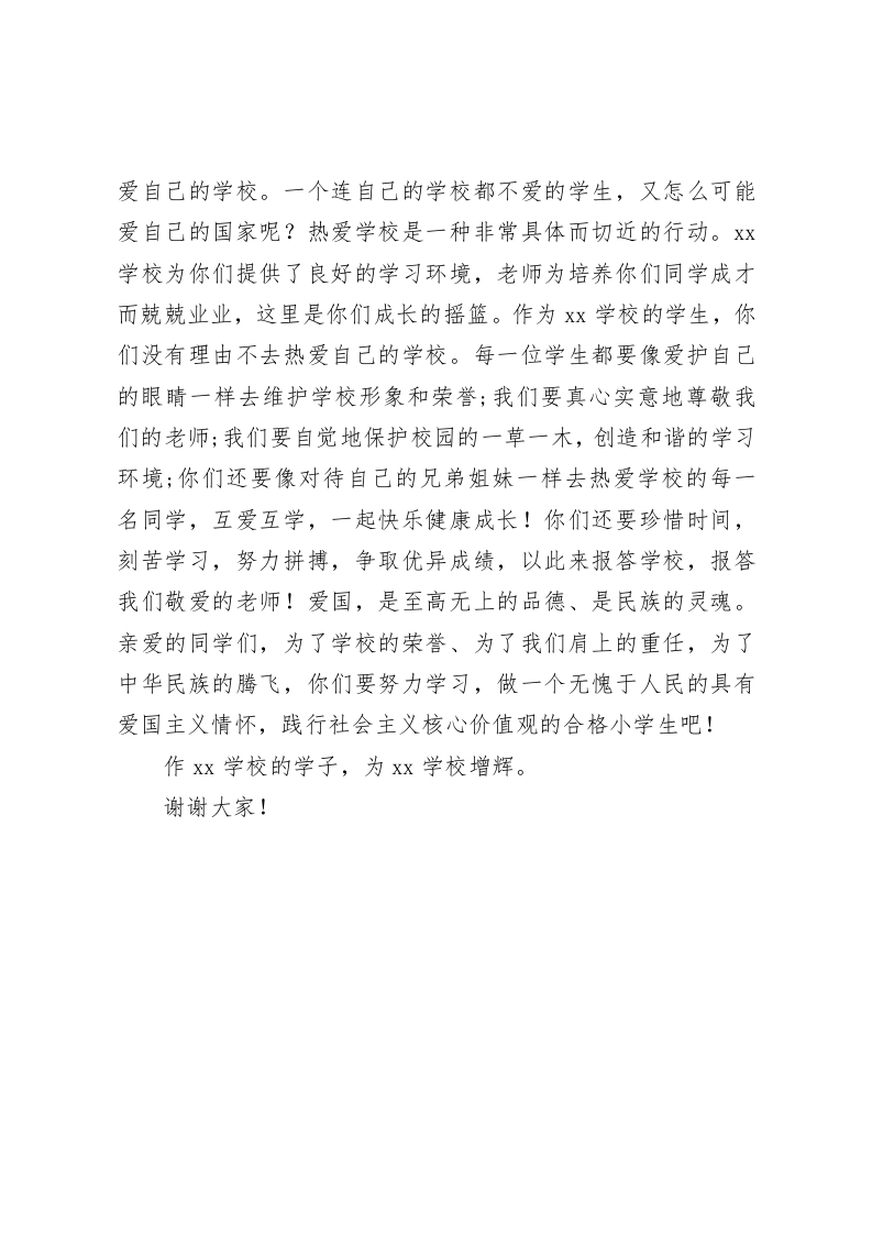 学生演讲比赛结束后,校长致辞爱国主义精神是我们这个民族最美的花朵老师们、同学们:刚才各位同学的演讲感人肺腑,催人奋进,表达了对党、对祖国、对人民的深厚感情,体现了同学们乐观向上的人生态度,勇于拼搏的奋进精神,展现了新世纪青少年奋发进取、积极向上的精神风貌。展现了新时代小学生朝气蓬勃、积极向上的精神风貌。中华民族是一个伟大的民族,爱国主义精神是我们这个民族最美的花朵。爱国,是一个神圣的字眼,在历史发展的曲折过程中,爱国主义历来是我国人民所崇尚的。进入二十一世纪,我们伟大的祖国日益繁荣昌盛,爱国主义更应该成为这个时代的最强音!爱国主义是我国各族人民团结奋斗的光辉旗帜,是推动我国社会历史前进的强大动力,而爱国教育无疑是最重要的教育!同学们,你们作为新世纪的青少年一代,是祖国的希望,祖国的未来必将属于你们。因此,大家更要继承和发扬崇高的爱国主义精神。继承和发扬爱国主义精神,要体现在行动中。如果祖国需要我们抛头颅、洒热血的话,每一个有正气的中国人都会毫不犹豫地为国捐躯。但是,现在我们生活在和平年代,祖国并不需要我们上战场。我们应该如何来爱国呢?作为学生你们首先要做到的是热