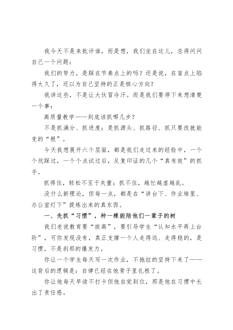抓教学质量校长讲话:这6项教学细节不上紧,全年质量抓得再死也白搭!各位老师,大家上午好。今天这个会,我想一开场就不讲铺垫了,直接说一个我们都清楚但常常不敢细想的问题:我们到底为什么这么忙?是的,确实忙。谁不忙呢?我从早上六点半到办公室锁门的教室开始数,晚自习查课的时候还有老师在讲投影;我看到无数个后备箱打开就是板书模板、A4资料、滚筒打印纸;我也知道有的老师一边发烧一边站着讲完了一节复习课。但这么辛苦,成绩上涨了吗?学生有质的提升了吗?口碑呈阶梯式上升了吗?说句难听的,我们有时候团团转,忙得脚步不沾地、脑袋更是空转三圈,但回头一看一一好像也不见得前面的那扇门打开了。为啥?不是我们不努力,而是我们容易掉入“努力得很用力,但方向跑偏”的怪圈。其实这几年我们特别热衷于努力:新练习册、新评价体系、新课改概念、新技术工具…但真正落到课堂时候,你想让学生提笔写,老师有信心改,家长愿意陪,整个闭环跑通一一比登天还难。