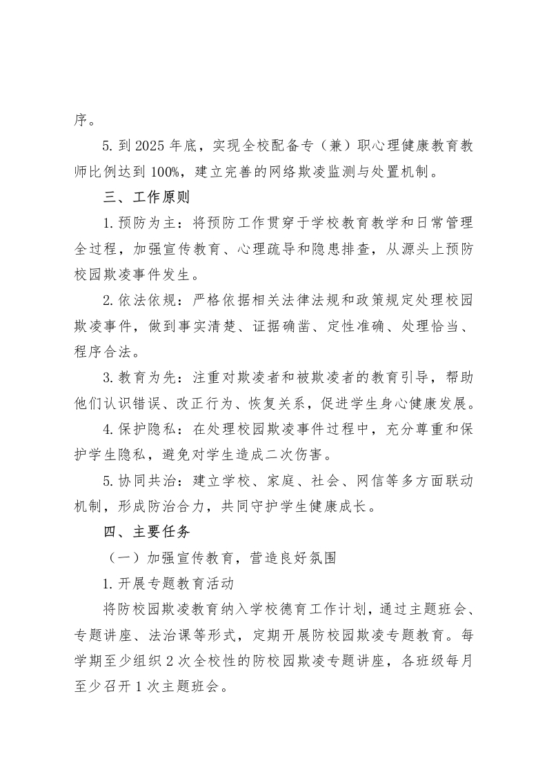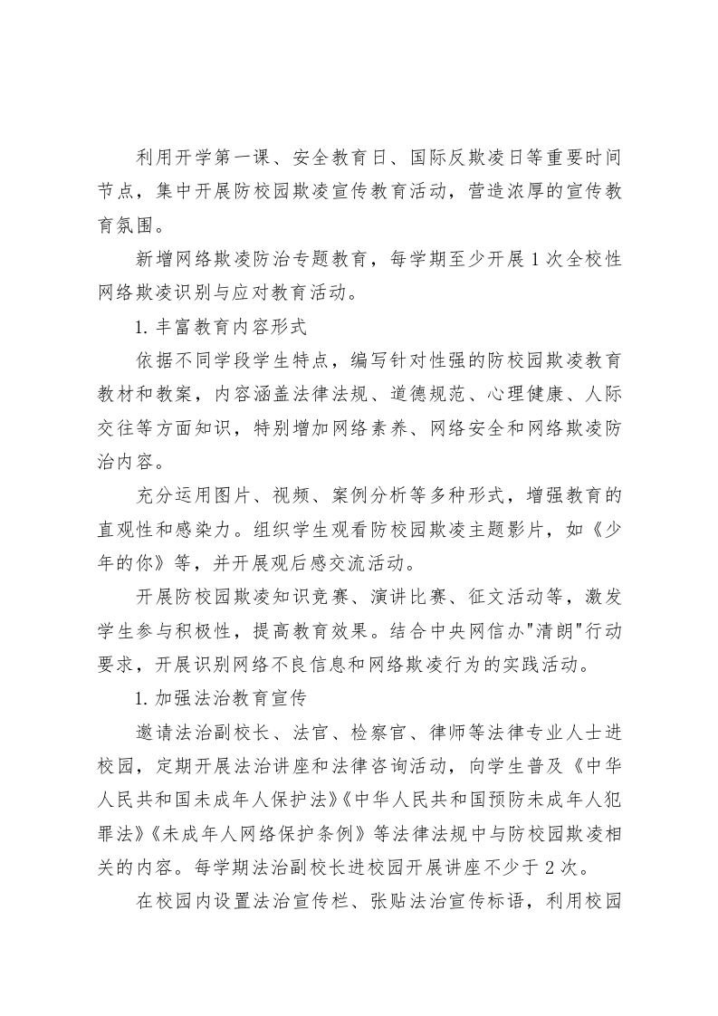 2025中小学防校园欺凌工作方案(修订版)一、指导思想以习近平新时代中国特色社会主义思想为指导,深入贯彻党的二十大和二十届二中、三中全会及全国教育大会精神,全面落实习近平总书记关于教育的重要论述。依据《教育强国建设规划纲要(2024-2035年)》《全面加强和改进新时代学生心理健康工作专项行动计划(2023一2025年)》以及教育部等十三部门《关于健全学校家庭社会协同育人机制的意见》等相关政策文件,坚持立德树人根本任务,以保障学生身心健康、创建平安和谐校园为目标,扎实推进中小学防校园欺凌工作,为学生成长成才营造良好环境。二、工作目标1.健全完善防校园欺凌工作制度体系,确保各项工作有章可循、规范有序,形成覆盖校园欺凌和网络欺凌的全方位防治体系。2.增强学生法治观念和自我保护意识,使学生能够自觉抵制校园欺凌行为,掌握应对欺凌的正确方法,特别是提高网络环境下的自我保护能力。3.构建学校、家庭、社会紧密协作的联动机制,形成强大工作合力,实现对校园欺凌行为的早发现、早干预、早处理。4.显著减少校园欺凌事件发生率,切实降低严重欺凌事件的发生,实现心理健康教育全覆盖,维护校园正常教育教学秩
