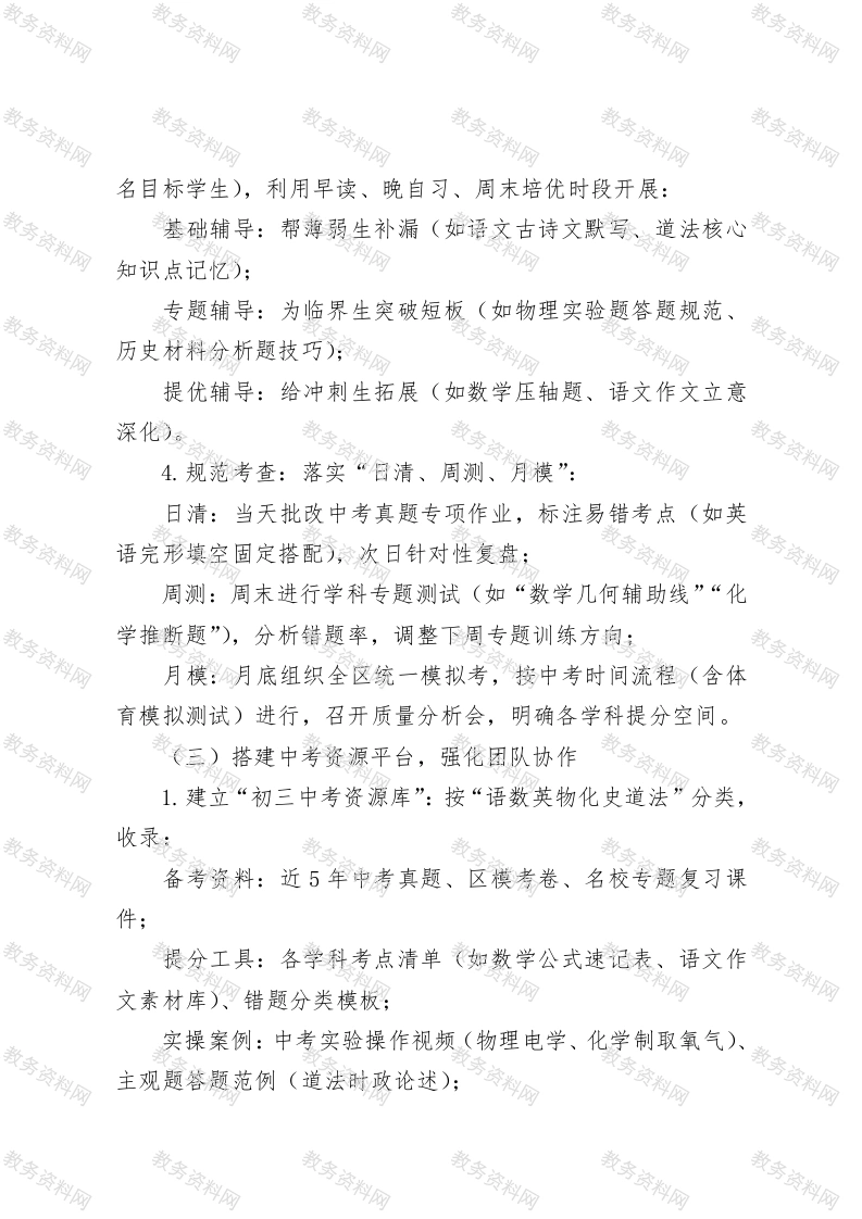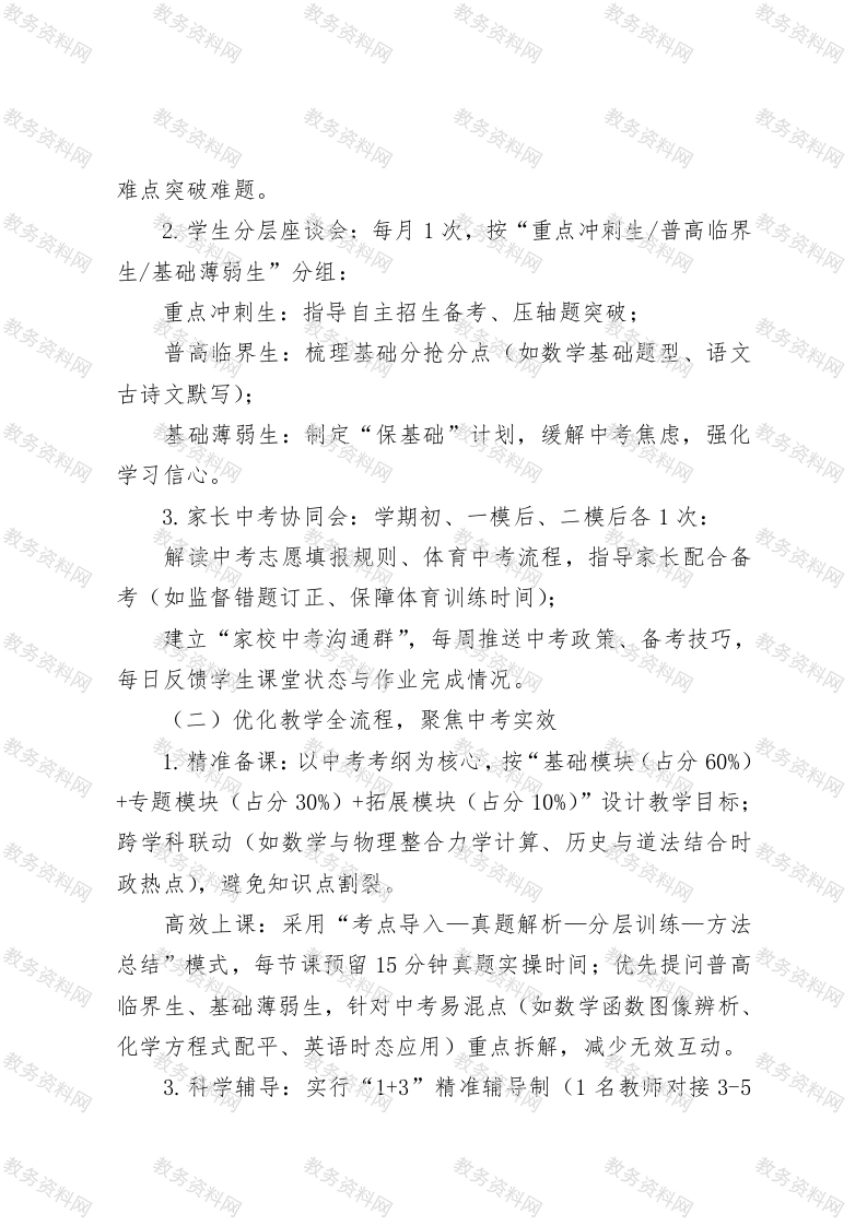 初中三年级毕业班教学质量提升实施方案初三年级作为中考冲刺关键期,是学生学业进阶与升学选择的核心阶段,其教学质量直接关系学生中考成绩与未来发展方向。为落实区教育局中考备考要求,结合我校初三学情(如学科薄弱点、学生分层情况),聚焦中考重难点突破,推动教学质量与升学指标双提升,特制定本方案。一、核心目标以“瞄准中考、分层突破、提升升学”为导向,力争实现:1.区中考综合排名进入前10%,各学科平均分超区平均分5分以上;2.普高上线率达85%,重点高中录取人数较上一届提升15%;3.中考学科(语数英物化史道法)优秀率超40%,学困生(中考总分低于普高线下30分)转化率达70%。二、实施策略(一)凝聚三方合力,筑牢中考备考基础1.毕业班教师中考专题会:每月2次,含“政策解读+学情分析+策略研讨”:解读最新中考改革方向(如题型变化、分值调整),明确各学科备考重点;分析模考数据,针对薄弱学科(如物理实验题、道法主观题)制定改进方案;邀请中考命题专家或名校骨干教师分享备考经验,解决重