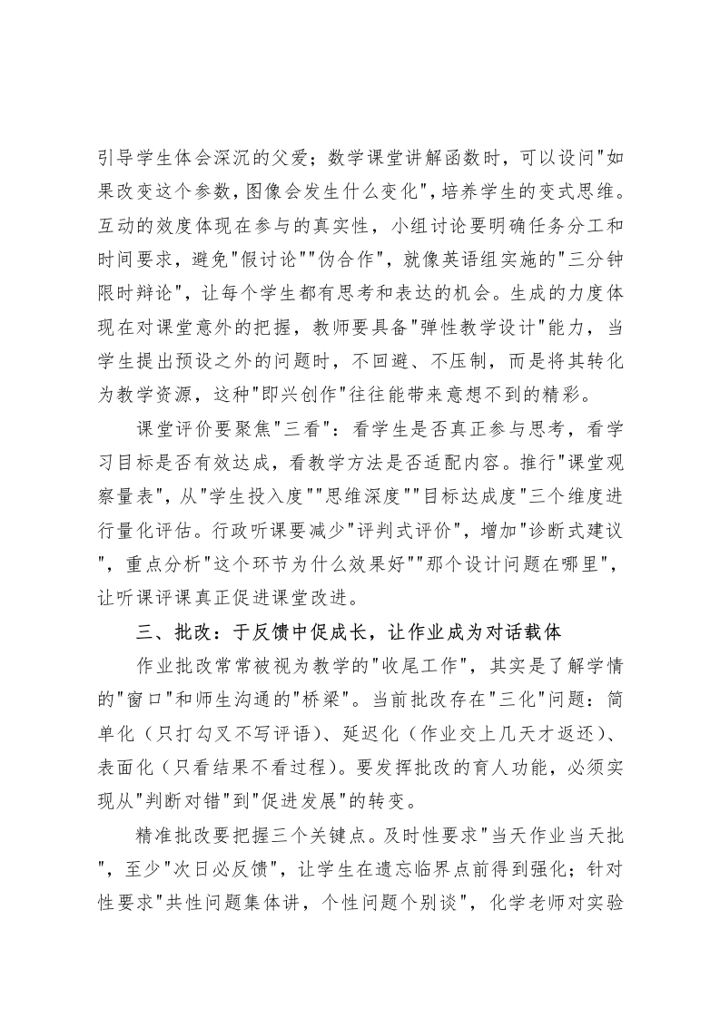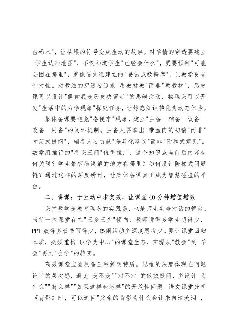 副校长在全体教师大会上的发言:看似寻常最奇崛教学常规里的质量辩证法各位同仁:大家好!今天我们站在教育改革的十字路口,一边是层出不穷的新理念新模式,一边是代代相传的"备讲批辅考评研"老传统。当我们忙着追逐教育创新的浪潮时,是否想过:那些被视为”老生常谈"的教学常规,或许正是破解质量密码的关键?古人云"看似寻常最奇崛,成如容易却艰辛”,教学工作尤其如此。今天,就让我们重新审视这些平凡日常中的不凡力量,共同探寻教学常规里的质量辩证法一一如何让简单的事情不简单,让平凡的工作不平庸,让常规要求成为卓越追求。一、备课:于细微处见真章,让教学设计有温度有深度备课作为教学的起点,常常被简化为"写教案"的机械劳动。但在优秀教师手中,备课却是一场与教材对话、与学生对话、与自己对话的深度思考。当前我们的备课存在"三重三轻"现象:重形式完整轻内容实效,重知识点罗列轻思维设计,重个人经验轻集体智慧。要突破这种困境,必须实现从"教案编写"到"教学研究"的范式转换。真正的深度备课,应当包含三个维度的穿透。对教材的穿透要做到"懂、透、化”,不仅理解表面文本,更要掌握知识背后的思维方法,像化学组那样将元素周期表转化为"物质世界的