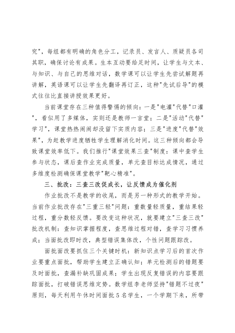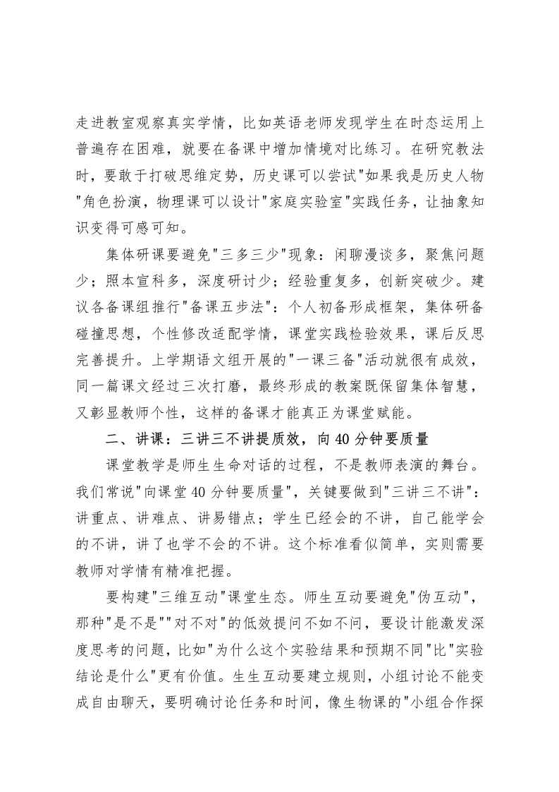 副校长在全体教师大会上的发言:七个关键词破解质量密码各位同仁:大家好!今天我们召开全体教师大会,想和大家探讨一个看似简单却关乎学校生存发展的核心命题一一为什么有的学校始终保持教学质量高位运行?为什么有的教师轻轻松松就能带出优秀班级?秘密或许就藏在”备、讲、批、辅、考、评、研"这七个朴素的教育关键词里。当教育改革的浪潮不断拍打岸边,我们既要抬头看路,更要低头拉车。今天,就让我们一起解开这七个关键词背后的质量密码,看看这些老生常谈的教学常规,如何在新时代焕发新生机,成为我们提升育人质量的"金钥匙”。一、备课:三问三思定方向,让每节课都有灵魂备课是教学的起点,也是决定课堂质量的关键。当前我们有些教案还停留在"教材内容搬家"的层面,缺乏对教学本质的思考。真正有效的备课,应该完成三次深度追问:这节课要带学生去哪里?学生现在在哪里?怎么带学生到达那里?这”三问”构成了备课的黄金三角,缺一不可。要做到这一点,首先要建立"三维备课"机制。在研究教材时,不能只看单篇内容,要把知识点放进整个学段的知识体系中,像数学组正在做的"知识树”梳理,就是很好的尝试,让每个知识点都能找到它在知识网络中的坐标。在研究学生时,要