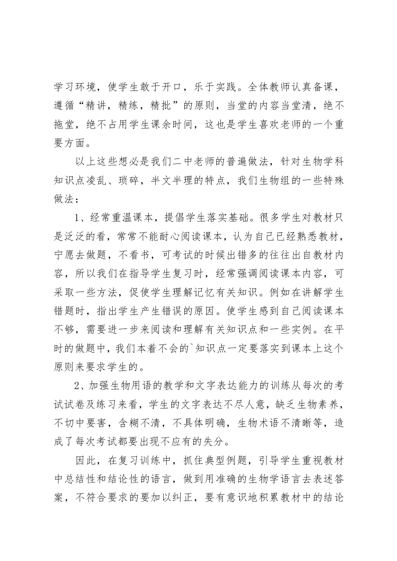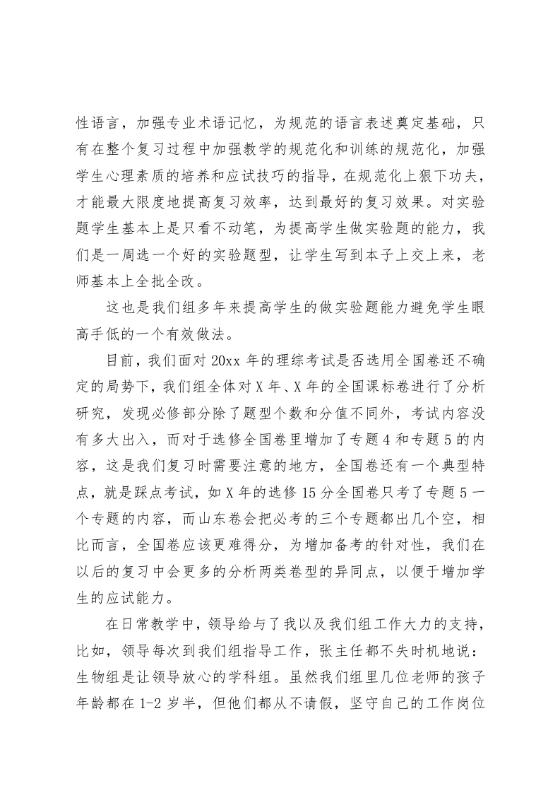 高三生物备课组长发言创造性地开展工作,为学校的发展做出更大贡献尊敬的领导,各位老师:今天我能够作为高三生物组的代表向各位领导汇报工作,感到非常荣幸。我们生物组共有5名教师,是个极富生气、积极向上的的群体。虽然从年龄上看我们都是年轻型的,但在教学水平上却都独具特色,陈xx老师是省优质课一等奖的获得者,我也连续两次获得市级教学能手的称号,杨Xx老师获市级优质课一等奖,高Xx和李xx老师也是去年高三留下的精英。我们所有的成员都满怀激情,对工作有敬业精神和吃苦耐劳的品质,我们成绩的取得是与我们团队的团结协作是分不开的,同时更离不开领导的关心和支持。下面我从以下几个方面汇报一下我们开展的工作。一、扎实教研,优化课堂我们教研组进行两个层面的教研:随机教研、集体教研。首先,课前课后,平时的谈笑间,我们无时不在进行随机教研,虽然仅仅是简短的一两句话,却能有目的地相互启发彼此的思路,通教学中遇到的问题。二、敬业爱生,激发学生的学习兴趣教学质量是我们的生命线,为尽快提高生物教学质量,我们全组教师借助课余时间疏通部分学生的学习障碍。经常找学生谈心,特别是李明云老师说话特逗,很多学生都主动找他谈心,在对老师信任的同时,也无形中提高了学习生物的积极性,在课堂教学中营造宽松的