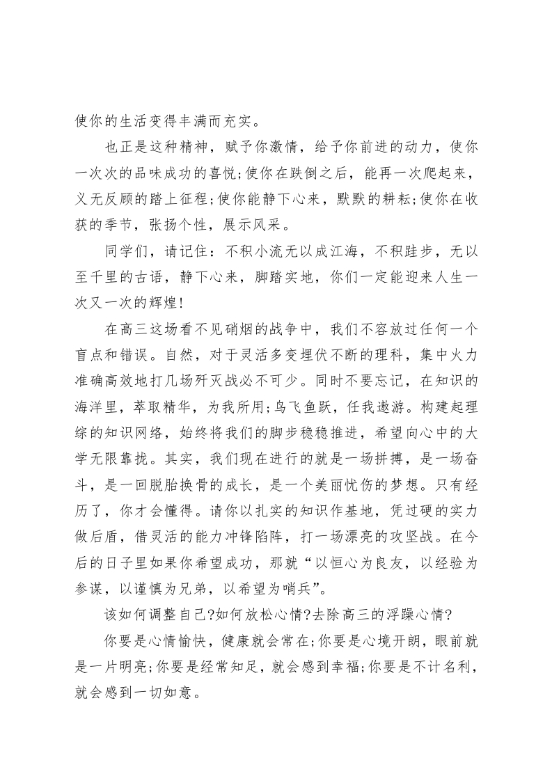 高三月考后,校长在国旗下演讲这一秒不放弃,下一秒有奇迹同学们:月考尘埃落定,一切似乎又归于平淡,但教室的灯光却更加耀眼,它驱走了黎明前的黑暗,你们用行动拉开了希望的大幕;匆忙的脚步依然清脆,它打破了清晨的宁静,是你们用行动吹响了奋起的号角。可是,在再次踏上征程之时,你是否静下心来,仔细想过,目前,自己的优势是什么,劣势又是什么?因为什么而赢,又输在哪里?你是否明确的告诉自己,我想要什么,我下一阶段的目标是什么?你是否已找准了自己的位置,我目前在哪里,想走到的目标还有多远,你是否清醒的认识到,成也罢,失也罢,都已成为过去,只有放下包袱,让心态归零,才能从头开始,只有放下,才能轻装上阵;只有放下,才能在跌倒后再爬起来,才能站在胜利的阶梯上走向另一次胜利!我们的老师们不怕你听不懂,就怕你不问;不怕你基础差,就怕你懒,不行动,不勤奋;更怕你丧失信心失去斗志,自暴自弃。人活着,最重要的就是要有一种精神。人的精神一旦被唤醒,其威力是无穷无尽的。一种不服输的精神,一种参与竞争的精神,一种勇于挑战自我,战胜自我的精神。这种精神,使你的生命充满活力;这种精神,使你的人生绽放光彩;这种精神