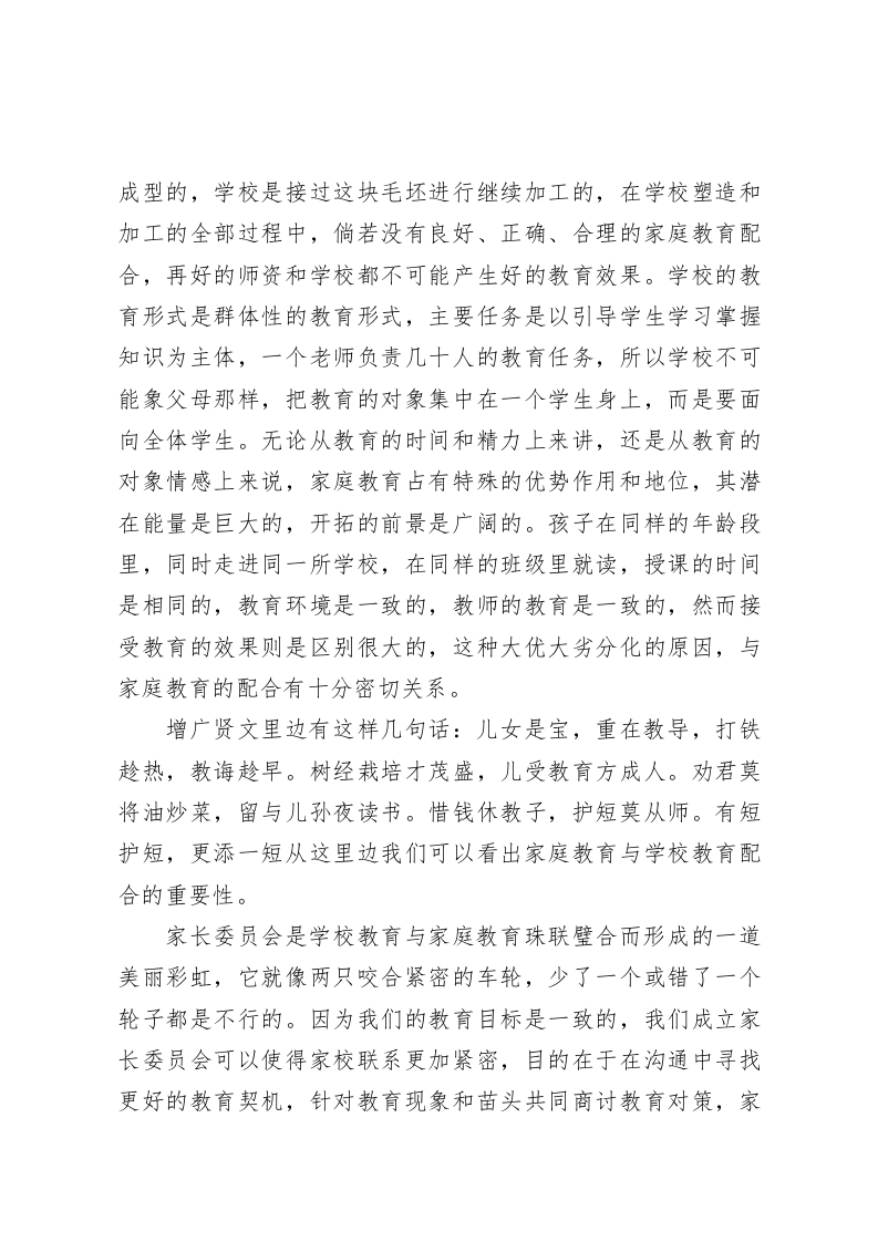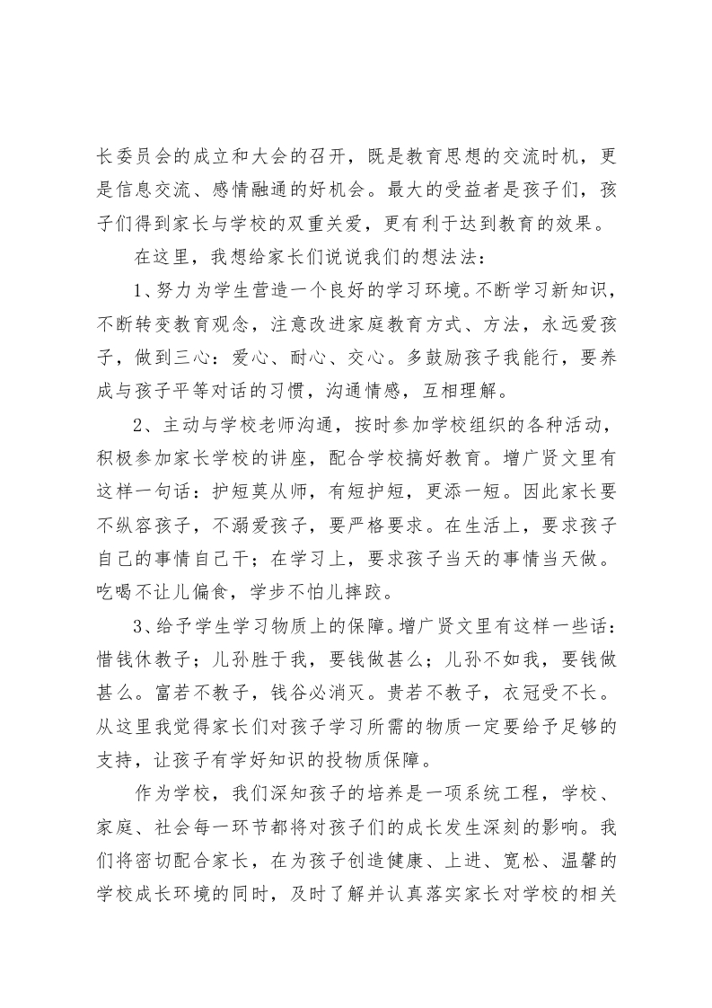 家委会会议上,校长讲话学校的教育如果没有家庭的辅助与协调,将面临很大的困境尊敬的各位家长委员们:上午好!首先,请允许我向各位家长委员的到来表示热烈的欢迎和衷心的感谢,对成立xx学校第X届家长委员会表示真诚地祝贺!今天能和各位委员一起探讨Xx学校的教育工作,我感到非常荣幸。因为我深知每位家长都深爱自己的儿女,都有说不尽的期待;也深知每一位家长都对学校都翘首关注,充满期待,时刻都关注这学校的发展。一个人的成长,离不开学校、家庭、社会三个方面的教育。而目前我国社会进入转型阶段,人们的思想观念、行为方式、消费观和以前相比有了根本性的改变。社会不良风气对学校教育的冲击越来越大。个别学生在校内外发生的某些不良行为和现象,作为学校、老师有时感到力不从心!甚至有时还要遇到个别家长的误解和责难。所以教师责任大,心理负担重,学校的社会压力更大。老师需要更多的理解,学校需要更多的支持!学校的教育如果没有家庭的辅助与协调,将面临很大的困境。我们必须与家长同心协力,在教育孩子的观念上、方法上达成共识,进行积极的合作。各位家长委员,心理学和教育学认为孩子的智力基础和品质基础是在家庭中奠定的,人的智力和品质是在家庭的塑造下