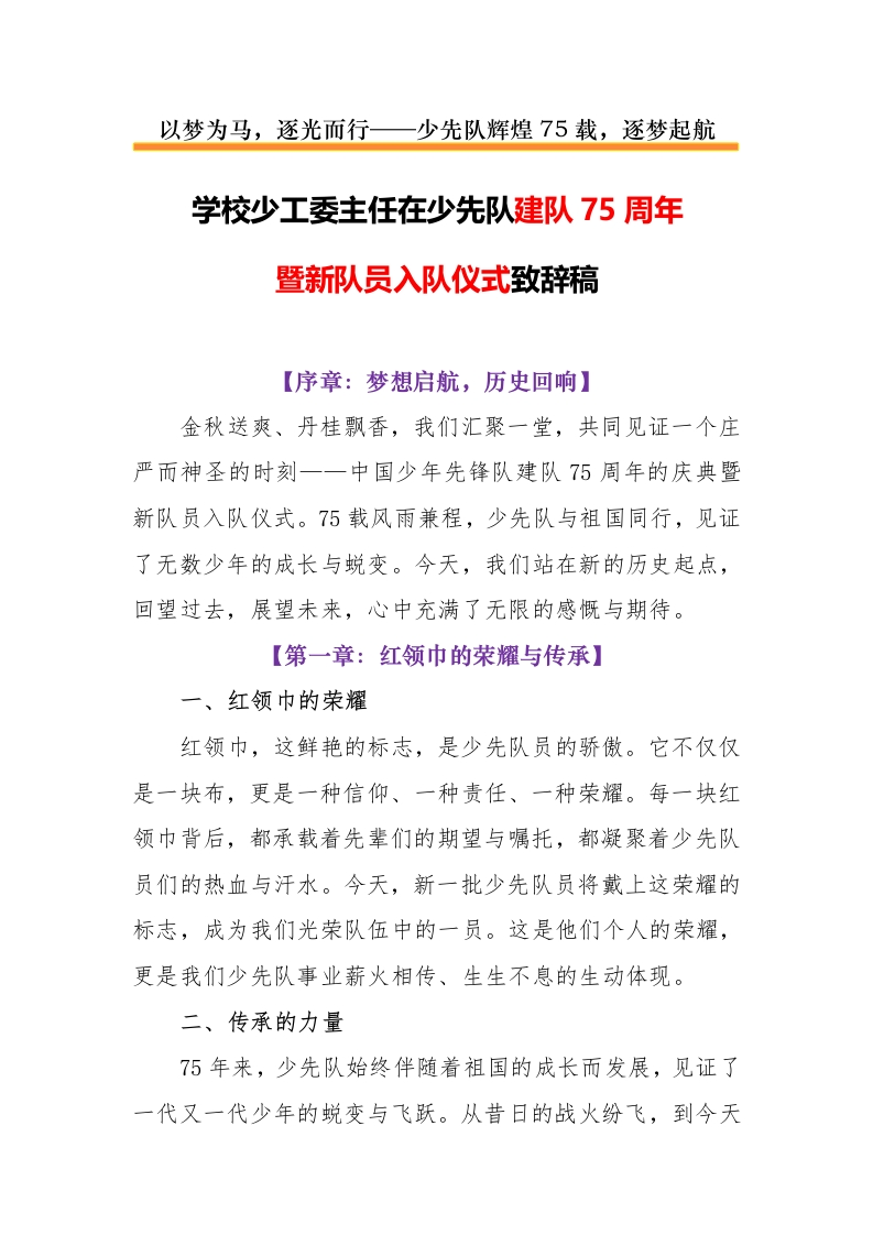 以梦为马,逐光而行一少先队辉煌75载,逐梦起航学校少工委主任在少先队建队75周年暨新队员入队仪式致辞稿【序章:梦想启航,历史回响】金秋送爽、丹桂飘香,我们汇聚一堂,共同见证一个庄严而神圣的时刻一一中国少年先锋队建队75周年的庆典暨新队员入队仪式。75载风雨兼程,少先队与祖国同行,见证了无数少年的成长与蜕变。今天,我们站在新的历史起点,回望过去,展望未来,心中充满了无限的感慨与期待。【第一章:红领巾的荣耀与传承】一、红领巾的荣耀红领巾,这鲜艳的标志,是少先队员的骄傲。它不仅仅是一块布,更是一种信仰、一种责任、一种荣耀。每一块红领巾背后,都承载着先辈们的期望与嘱托,都凝聚着少先队员们的热血与汗水。今天,新一批少先队员将戴上这荣耀的标志,成为我们光荣队伍中的一员。这是他们个人的荣耀,更是我们少先队事业薪火相传、生生不息的生动体现。二、传承的力量75年来,少先队始终伴随着祖国的成长而发展,见证了一代又一代少年的蜕变与飞跃。从昔日的战火纷飞,到今天