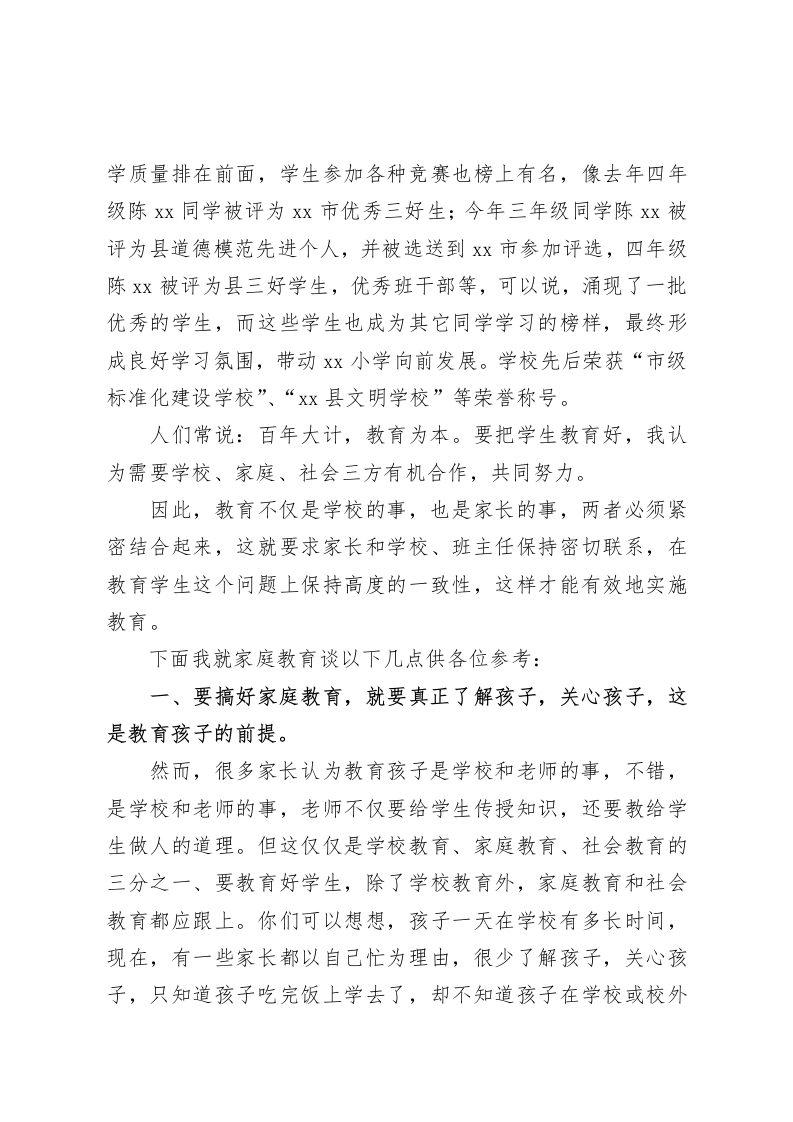 家长会上,校长发言虽然我们很少见面,但我们的心是相通的尊敬的各位家长,你们好!首先,让我代表学校及全体教职工,对在百忙中抽出时间来我校参加家长会的各位家长表示热烈的欢迎,这既是对孩子的关心,也是对学校工作的支持。很多家长,虽然我们很少见面,但我们的心是相通的,都是为了孩子。父母是孩子的启蒙老师,家庭教育对孩子的成长起着举重轻重的作用,老师是孩子成长的引路人,对于孩子的成长起着深刻的影响,只有将家庭,学校,社会溶为一体,才能更好的培养孩子,全面发展,成为有用之才,相信我们能有共同的话题,下面我将xx小学的基本情况和办学特色向大家作个介绍。xx小学是一所农村小学。学校现有在校学生200人,7个小学教学班,一个学前班,教职工13人(其中小学教师11人,学前教师1人,后勤1人,大部分是本地老师)。是Xx乡一所师资力量比较雄厚的一所小学近年来,学校以“办人·民满意学校,努力提升教学质量”为办学目标,秉承“以人为本,和谐发展”的办学理念,坚持“面向全体,发展个性,实践创新,培养能力,为学生终身发展奠基”的工作思路,以南音传统文化教育为主要办学特色,坚持走素质教育之路,逐步探索形成了“育人为本,素质为重,关注发展”的办学模式。学校强化制度建设,主要体现在: