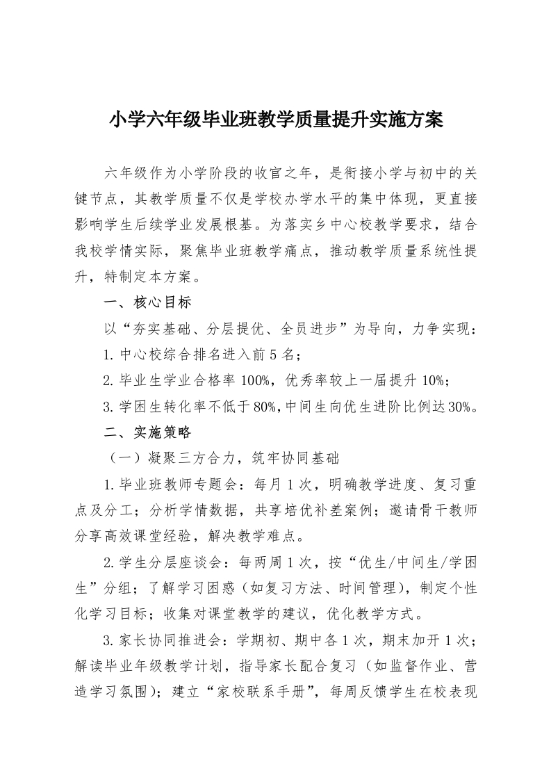 小学六年级毕业班教学质量提升实施方案六年级作为小学阶段的收官之年,是衔接小学与初中的关键节点,其教学质量不仅是学校办学水平的集中体现,更直接影响学生后续学业发展根基。为落实乡中心校教学要求,结合我校学情实际,聚焦毕业班教学痛点,推动教学质量系统性提升,特制定本方案。一、核心目标以“夯实基础、分层提优、全员进步”为导向,力争实现:1.中心校综合排名进入前5名:2.毕业生学业合格率100%,优秀率较上一届提升10%:3.学困生转化率不低于80%,中间生向优生进阶比例达30%。二、实施策略(一)凝聚三方合力,筑牢协同基础1.毕业班教师专题会:每月1次,明确教学进度、复习重点及分工;分析学情数据,共享培优补差案例;邀请骨干教师分享高效课堂经验,解决教学难点。2.学生分层座谈会:每两周1次,按“优生/中间生/学困生”分组;了解学习困惑(如复习方法、时间管理),制定个性化学习目标;收集对课堂教学的建议,优化教学方式。3.家长协同推进会:学期初、期中各1次,期末加开1次;解读毕业年级教学计划,指导家长配合复习(如监督作业、营造学习氛围):建立“家校联系手册”,每周反馈学生在校表现