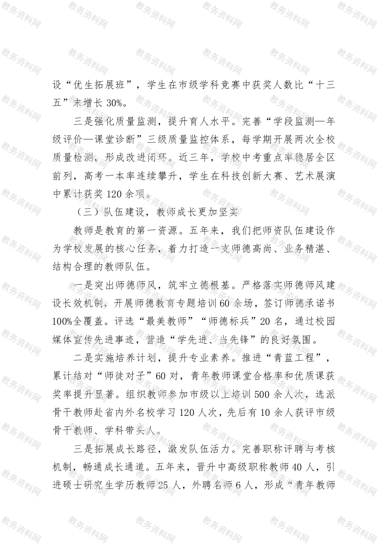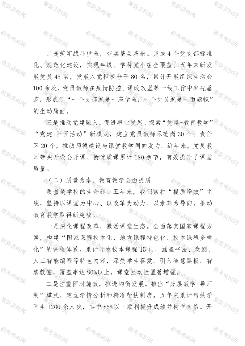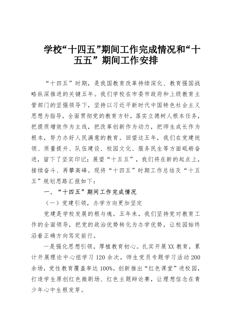 学校“十四五”期间工作完成情况和“十五五”期间工作安排“十四五”时期,是我国教育改革持续深化、教育强国战略纵深推进的关键五年。我们学校在市委市政府和上级教育主管部门的坚强领导下,坚持以习近平新时代中国特色社会主义思想为指导,全面贯彻党的教育方针,落实立德树人根本任务,把提质增效作为主线,把改革创新作为动力,把师生成长作为根本,努力办好人民满意的教育。回望这五年,我们在党建统领、质量提升、队伍建设、校园文化、服务民生等方面砥砺奋进,留下了坚实印记:展望“十五五”,我们将在新的起点上,接续奋斗、再攀高峰。现将“十四五”时期工作总结及“十五五”规划思路汇报如下:一、“十四五”期间工作完成情况(一)党建引领,办学方向更加坚定党建是学校发展的根与魂。五年来,我们坚持党对教育工作的全面领导,把党的政治优势转化为办学优势,让校园始终沿着正确方向笃定前行。一是强化思想引领,厚植教育初心。扎实开展XX教育,累计开展理论中心组学习120余次,师生党员专题学习活动200余场,党性教育覆盖率达100%。创新推出“红色课堂”进校园,打造学生原创红色微剧场、红色主题辩论赛,让理想信念在青少年心中生根发芽。