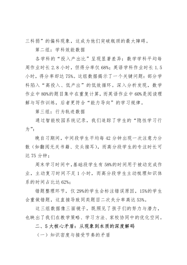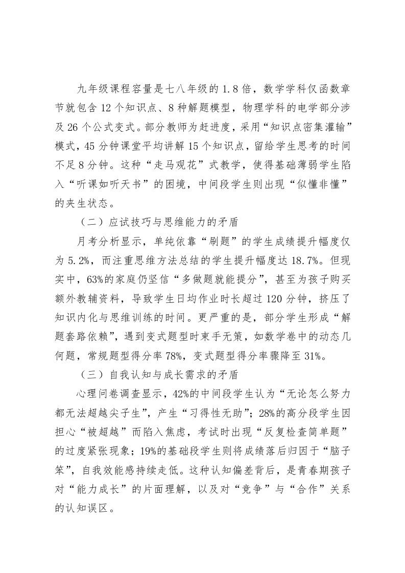 第一次月考后,九年级家长会上,校长发言:3组关键数据、5大突围策略,解码九年级成长方程式尊敬的各位家长:大家晚上好!金秋九月,丹桂飘香。当九年级的孩子们刚刚适应新学期的节奏,第一次月考的成绩便如一面镜子,映照出成长的真实模样。今天,我想以“数据为镜、以问题为钥、以协同为桥”,与各位家长共同解码九年级这道“成长方程式”。我们将通过3组核心数据透视现状,剖析5大关键矛盾,并聚焦家校协同的5大突围策略,让每个孩子都能在冲刺阶段找到属于自己的“最优解”。一、3组关键数据透视:从分数到成长的全景图谱(一)学业表现数据:纺锤形分布下的隐忧与契机本次月考覆盖全部9个学科,我们提取了最具代表性的3组数据:第一组:总分分层数据全年级620名学生中,总分600分以上(满分760分)的高分段占比12%,450-600分的中间段占比68%,450分以下的基础段占比20%。这个“纺锤形”结构看似合理,但中间段学生的学科均衡性令人担忧一一数学与语文的分差超过30分的学生占比达41%,物理与历史的“文理鸿沟”在52%的学生中存在。更值得注意的是,中间段学生中,有34%的孩子存在“两科强、