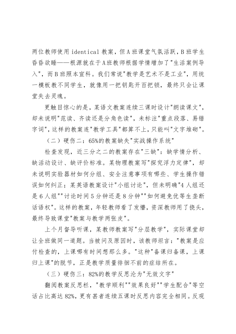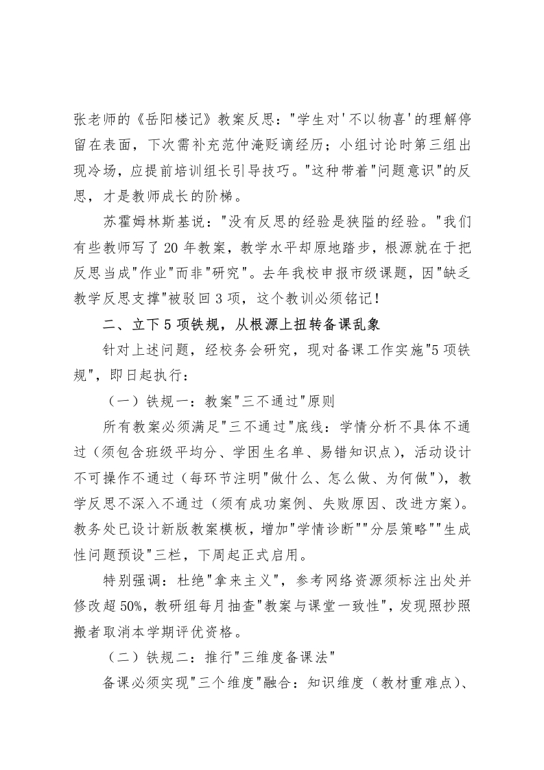 教师例会上,教学副校长讲话:3大硬伤刺痛全场!5项铁规重塑备课质量各位老师:大家好!刚才教务处通报了本学期备课检查结果,整体合格率达92%,但其中37份教案被评定为"不合格",12份被直接标注”废纸级”。今天的会议不回避问题、不遮掩矛盾,我们要直面备课工作中的"3大硬伤”,更要立下"5项铁规”,用刀刃向内的决心推动教学质量根本性提升。一、成绩值得肯定,但问题更需警醒过去一学期,我们欣喜地看到大多数教师始终坚守教学初心:全体教师实现"零无教案授课”,83%的教案完成"二次备课"修订,数学组"分层作业设计”、语文组"单元整体备课"等创新做法在市级交流中获好评。特别要表扬的是,李老师团队开发的"情境化教案模板"使所带班级平均分提升12.5分,王老师坚持"课后30分钟反思",一年间形成2万余字教学札记,这些实践充分证明:高质量备课是高效课堂的生命线。但今天我要重点讲问题。检查中发现的"3大硬伤",已经严重影响教学质量,必须引起全体教师高度警惕一一二、直面3大硬伤:这些问题正在毁掉课堂(一)硬伤一:90%的"克隆教案"正在杀死教学个性抽查显示,32%的教案存在"全文复制"现象,某历史教师的教案甚至与2018年网络资源完全雷同。上周听初二年级数学课,