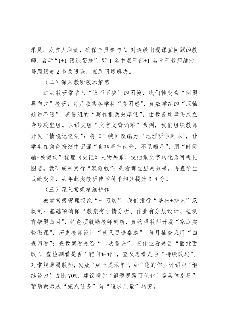 教学副校长管理经验交流会上的发言:破解教学管理五密码—一从课堂到成长的实践与思考各位教育同仁、各位领导:大家好!我是XX学校的教学副校长XXX。今天怀着交流共进的初心,与各位探讨“如何以管理破题,用实践作答,让教学质量‘看得见提升’、教师成长‘摸得着路径’、学生发展‘有温度刻度’”。在教育改革深水区,我们始终相信:教学管理的本质,是用科学的方法激活人的潜能。接下来,我将以“五把钥匙”为线索,分享我校破解教学管理难题的实践密码。一、密码一:扎根教学一线一一让管理直抵课堂核心管理的生命力在课堂,脱离一线的决策如同无源之水。我们以“三深入”机制打通管理末梢,让每一项举措都能精准落地。(一)深入课堂听诊把脉我们建立“三维听课体系”:教学管理层每周至少深入4节课堂,重点关注青年教师的“站稳讲台”课、骨干教师的“创新示范”课、问题班级的“诊断改进”课。听课前与教师共同确定观察维度,如“学生思维活跃度”会记录“高阶问题回应次数”,“分层教学实效”会统计“不同层次学生任务完成率”。课后反馈拒绝“模糊评价”,而是用数据画像:“这节课小组讨论环节,第三组仅2人发言,建议采用‘角色分工卡’明确记