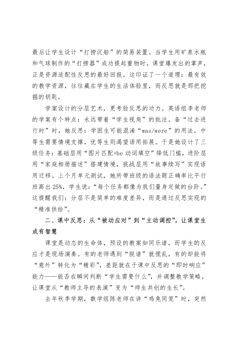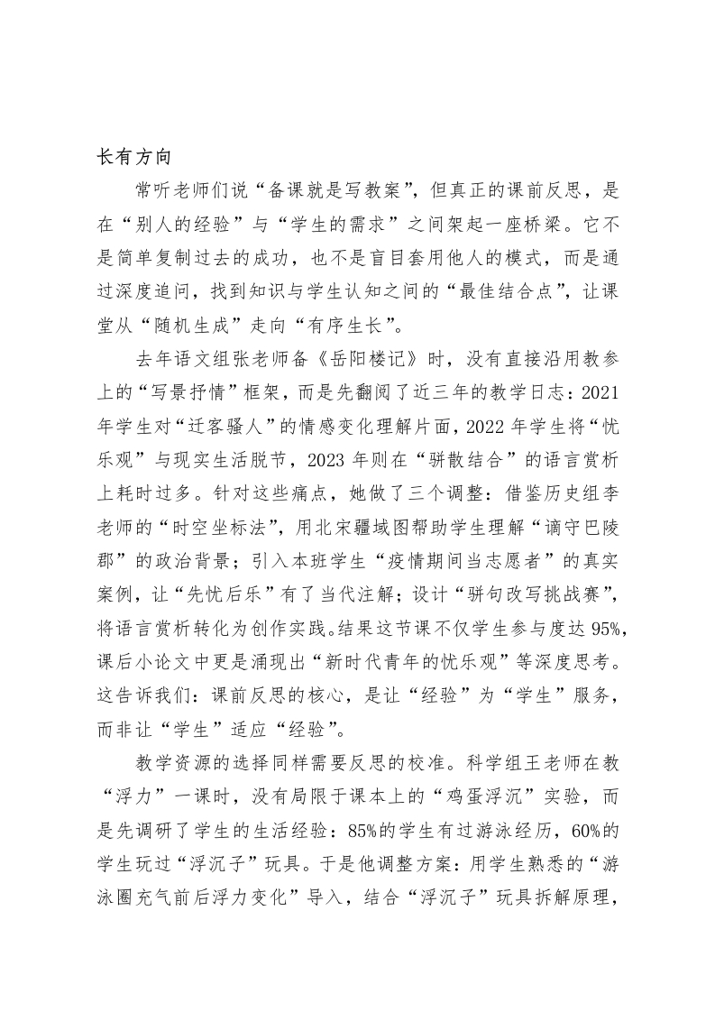 教学副校长在全体教师会上的发言:从“经验重复”到“专业生长”各位同仁:大家上午好!今天我们共同探讨一个看似平凡却决定教学高度的话题一一教学反思。每天走进课堂前,我们是否想过:为什么同样的教案,去年教得磕磕绊绊,今年却能游刃有余?为什么有的老师带过几届学生后,教学水平稳步提升,有的却陷入“年年岁岁课相似,岁岁年年效不同”的困境?答案或许就藏在“反思”这两个字里。著名教育学家波斯纳曾言:“经验+反思=成长。”这句话道出了一个朴素的真理:没有反思的经验,只是重复的循环唯有经过反思淬炼的经验,才能成为专业生长的养分。咱们学校近三年的教师发展数据印证了这一点:坚持系统反思的教师,其课堂效率平均提升40%,学生深度学习发生率是不常反思教师的2.3倍,个人专业成果产出量更是实现了翻番。这些数据背后,是反思从“隐性意识”到“显性实践”的转变,是教学从“经验驱动”到“研究驱动”的跨越。今天,我想结合教学实践中的真实案例,与大家共同探索教学反思如何打破“经验重复”的魔咒,构建“专业生长”的闭环,让每一节课都成为师生共同成长的阶梯。一、课前反思:从“照搬经验”到“精准预设”,让课堂生