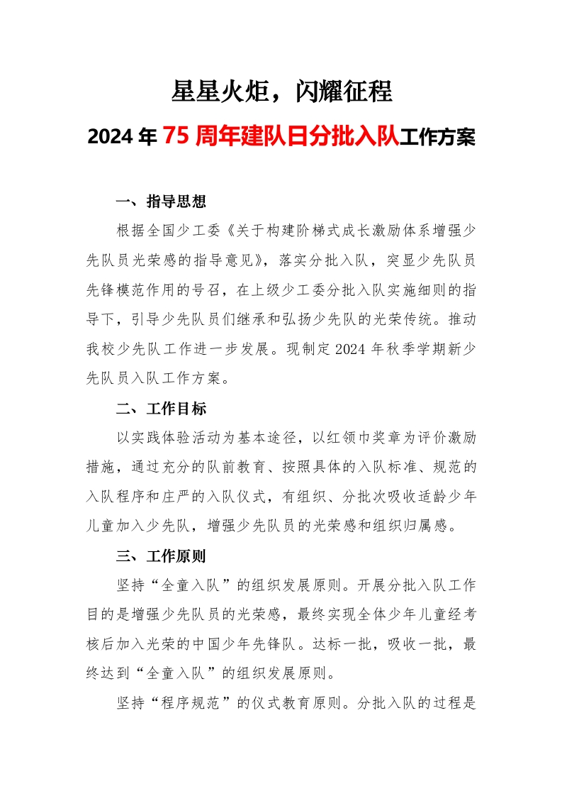 星星火炬,闪耀征程2024年75周年建队日分批入队工作方案一、指导思想根据全国少工委《关于构建阶梯式成长激励体系增强少先队员光荣感的指导意见》,落实分批入队,突显少先队员先锋模范作用的号召,在上级少工委分批入队实施细则的指导下,引导少先队员们继承和弘扬少先队的光荣传统。推动我校少先队工作进一步发展。现制定2024年秋季学期新少先队员入队工作方案。二、工作目标以实践体验活动为基本途径,以红领巾奖章为评价激励措施,通过充分的队前教育、按照具体的入队标准、规范的入队程序和庄严的入队仪式,有组织、分批次吸收适龄少年儿童加入少先队,增强少先队员的光荣感和组织归属感。三、工作原则坚持“全童入队”的组织发展原则。开展分批入队工作目的是增强少先队员的光荣感,最终实现全体少年儿童经考核后加入光荣的中国少年先锋队。达标一批,吸收一批,最终达到“全童入队”的组织发展原则。坚持“程序规范”的仪式教育原则。分批入队的过程是