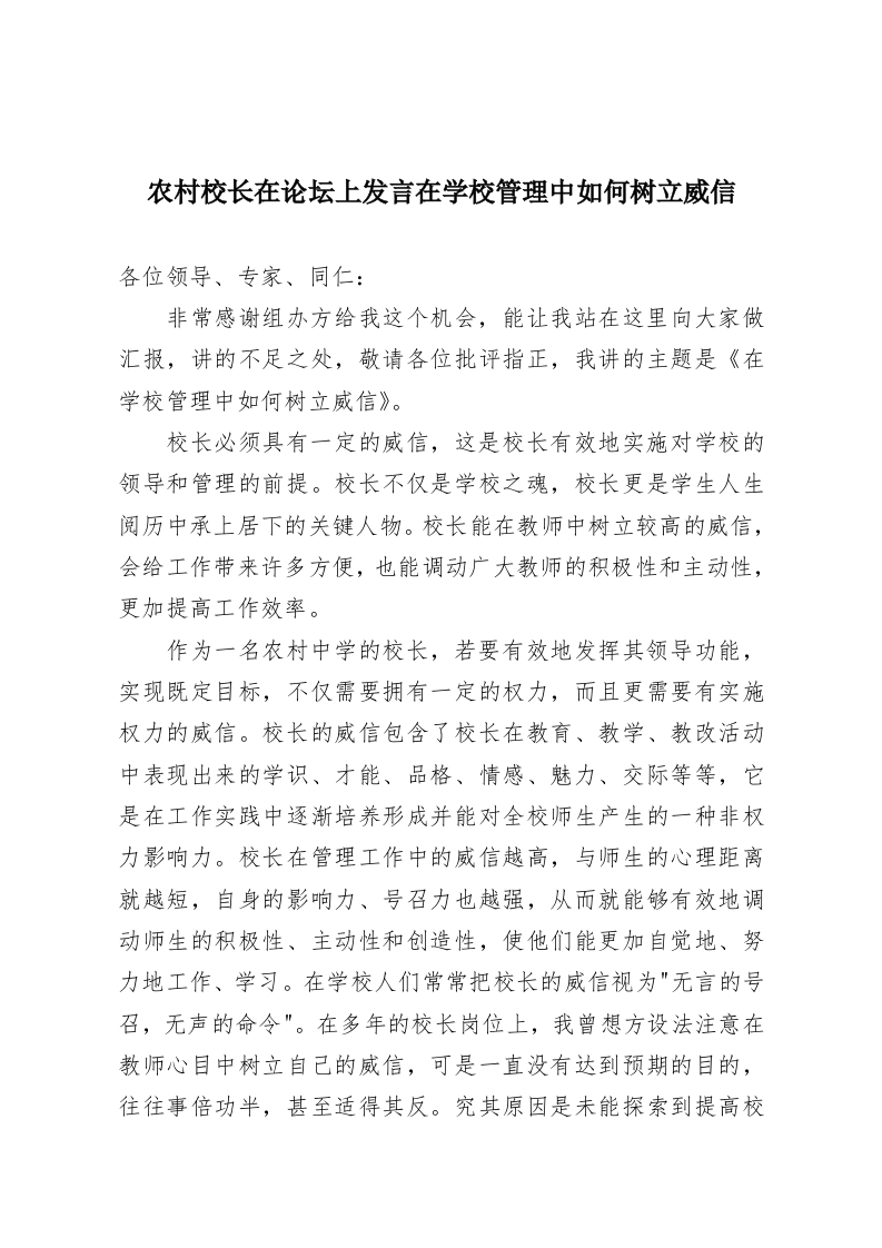 农村校长在论坛上发言在学校管理中如何树立威信各位领导、专家、同仁:非常感谢组办方给我这个机会,能让我站在这里向大家做汇报,讲的不足之处,敬请各位批评指正,我讲的主题是《在学校管理中如何树立威信》。校长必须具有一定的威信,这是校长有效地实施对学校的领导和管理的前提。校长不仅是学校之魂,校长更是学生人生阅历中承上居下的关键人物。校长能在教师中树立较高的威信,会给工作带来许多方便,也能调动广大教师的积极性和主动性,更加提高工作效率。作为一名农村中学的校长,若要有效地发挥其领导功能,实现既定目标,不仅需要拥有一定的权力,而且更需要有实施权力的威信。校长的威信包含了校长在教育、教学、教改活动中表现出来的学识、才能、品格、情感、魅力、交际等等,它是在工作实践中逐渐培养形成并能对全校师生产生的一种非权力影响力。校长在管理工作中的威信越高,与师生的心理距离就越短,自身的影响力、号召力也越强,从而就能够有效地调动师生的积极性、主动性和创造性,使他们能更加自觉地、努力地工作、学习。在学校人们常常把校长的威信视为"无言的号召,无声的命令”。在多年的校长岗位上,我曾想方设法注意在教师心目中树立自己的威信,可是一直没有达到预期的目的,往往事倍功半,甚至适得其反。究其原因是未能探索到提高校