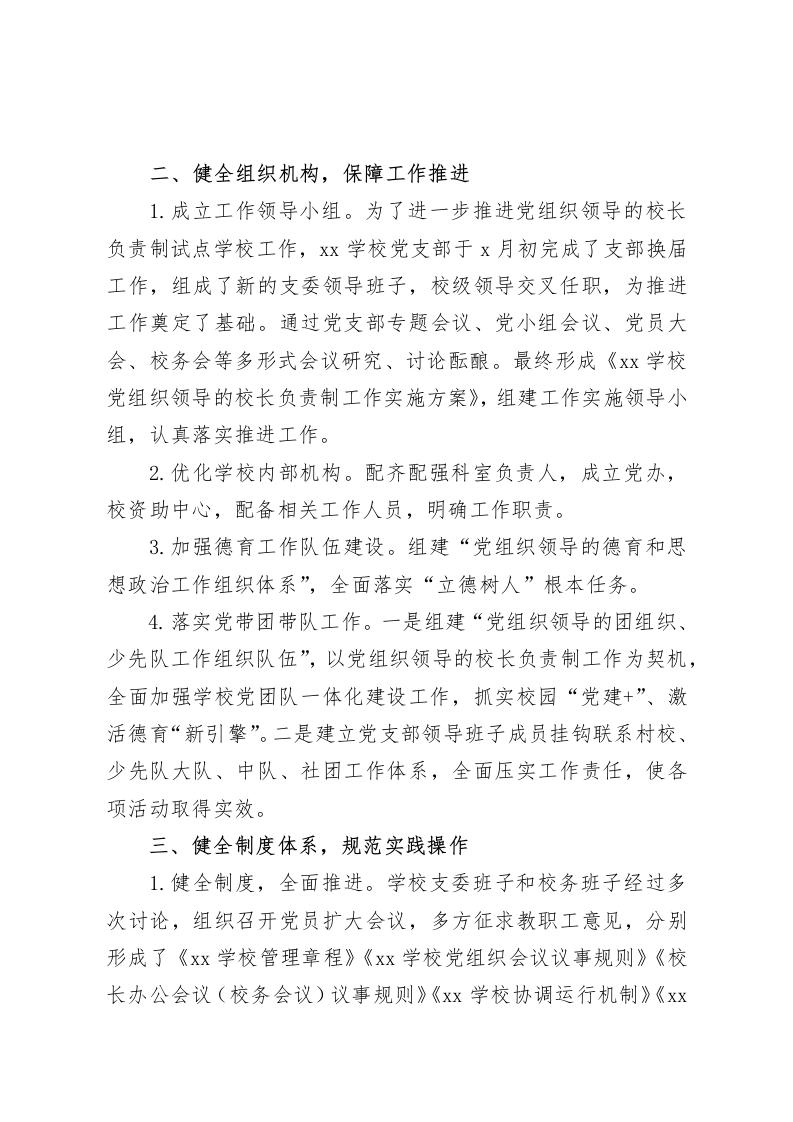 落实党组织领导的校长负责制试点工作,校长汇报发言进一步规范学校各项工作的管理,不断提高教育教学质量中小学校试行“党组织领导的校长负责制”是新形势的必然要求。是实现党的“全面领导”的重要体现,是加强党的全面领导在中小学校的重大实践,更是对学校管理机制的深刻变革。Xx年x月推进该项工作以来,我们Xx学校党支部紧紧围绕各级实施要求,着力推进党组织领导的校长负责制工作,先试先行,重抓落实,以党建为引领高质量发展好教育教学工作,促进学校全面发展。现将工作推进落实情况报告如下。一、统一思想认识、广泛宣传发动1.班子讨论,提高认识。召开支委会3次,党员大会2次,以书记面对面形式,专题讨论“党组织领导的校长负责制”推进实施工作。使全体党员认识,实行“党组织领导的校长负责制”的重要性和必要性。促使学校党组织从原来的“政治核心和监督保证”,转变为“总揽全局和全面领导”,目的是为了着力解决“重业务,轻党建”的思想。2.广泛宣传,统一思想。以党小组为单位,以教职工大会为契机,广泛宣传“党组织领导的校长负责制”的核心要义,促使全体教职工充分认识到:推进“党组织领导的校长负责制”,最终是为了“加强党的领导、优化管理方式、促进学校发展,践行立德树人”,高质量发展好教育教学。