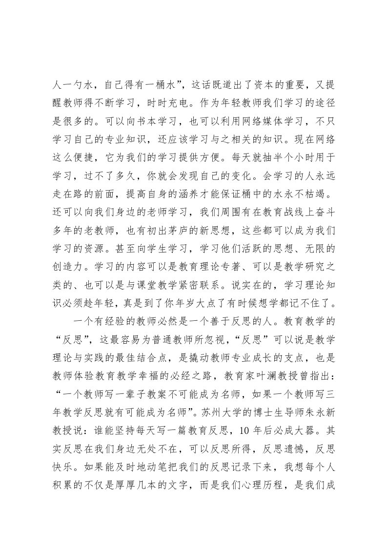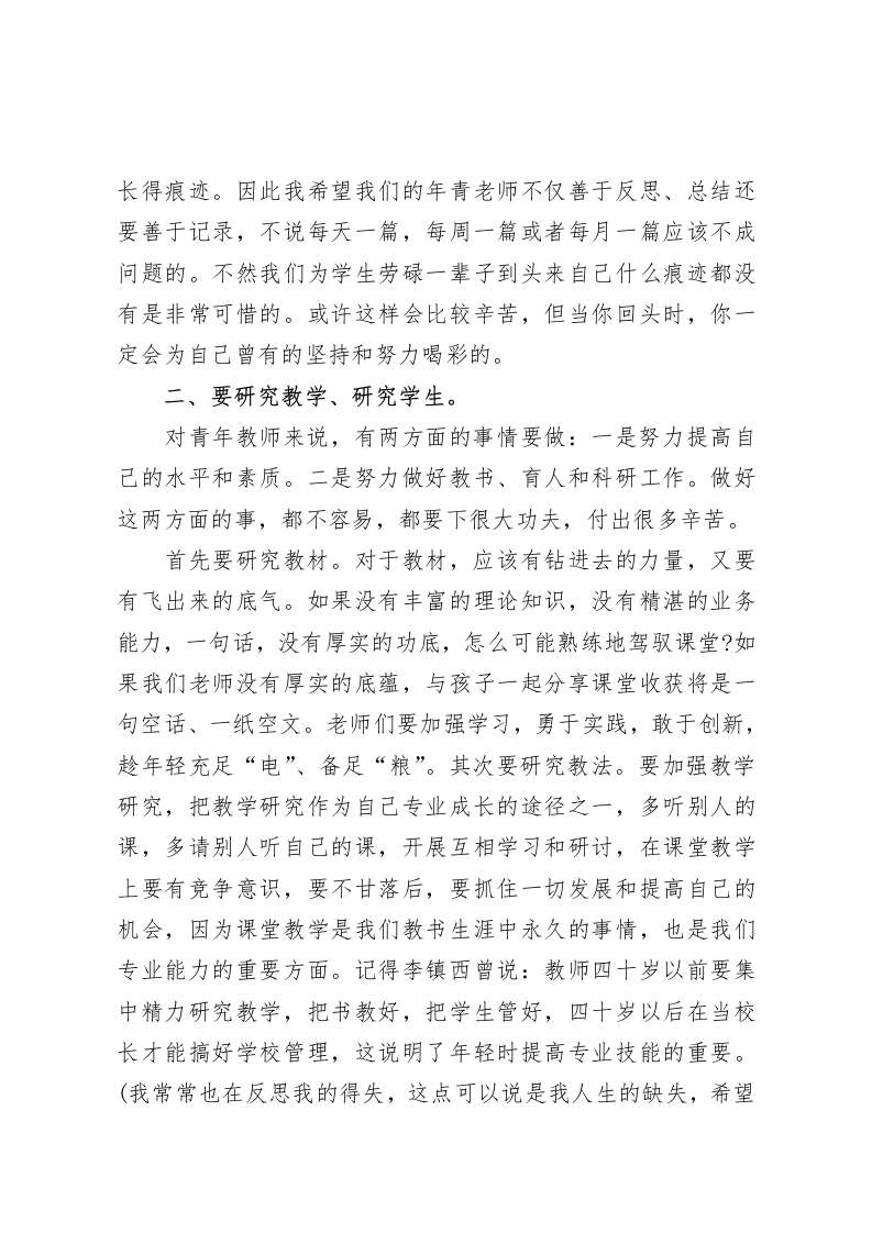 青年教师座谈会上,校长讲话每天坚持一点点,就是领先的开始!每天多做一点点,就是成功的开始!每天创新一点点,就是卓越的开始各位老师:俗话说:当局者迷,这点不仅仅表现在领导在管理上会迷于当局,表现在老师在前行的道路上也会陷入迷途,当然也表现在我们彼此之间由于信息不畅而迷茫。所以,要建立起增进了解、理解的平台.今天,我们举行座谈会就是一个有益的平台。一个让一种思想撞击另一种思想的平台。大家的建议,将成为下一阶段学校制定相关政策、制度的重要参考依据。说到青年教师,就不得不想到两个词一一成长与发展。青年教师的成长与发展决定着我们学校未来的发展,所以对于一所学校来讲,加强青年教师的培养是至关重要的。刚才听取了我们老师们的很多心理话,对我的触动也很大的,回想我自己的成长,越发认识到年轻时学习和提高的重要,我虽然年纪并不算大,但现在有些事情对于我来说确实感到力不从心了,因此我希望大家千万不要像我一样错过了好时光。下面我想和大家谈谈我的心里话:一、青年教师要善于学习、善于反思。有人说,年轻就是资本;然而这种资本很容易受到时间的限制。于是,人们很快认识到资本是可以通过积累而逐渐增多的,学习便成了积累资本最有效的方法。俗话说得好一一“要想给