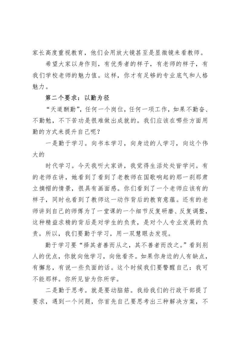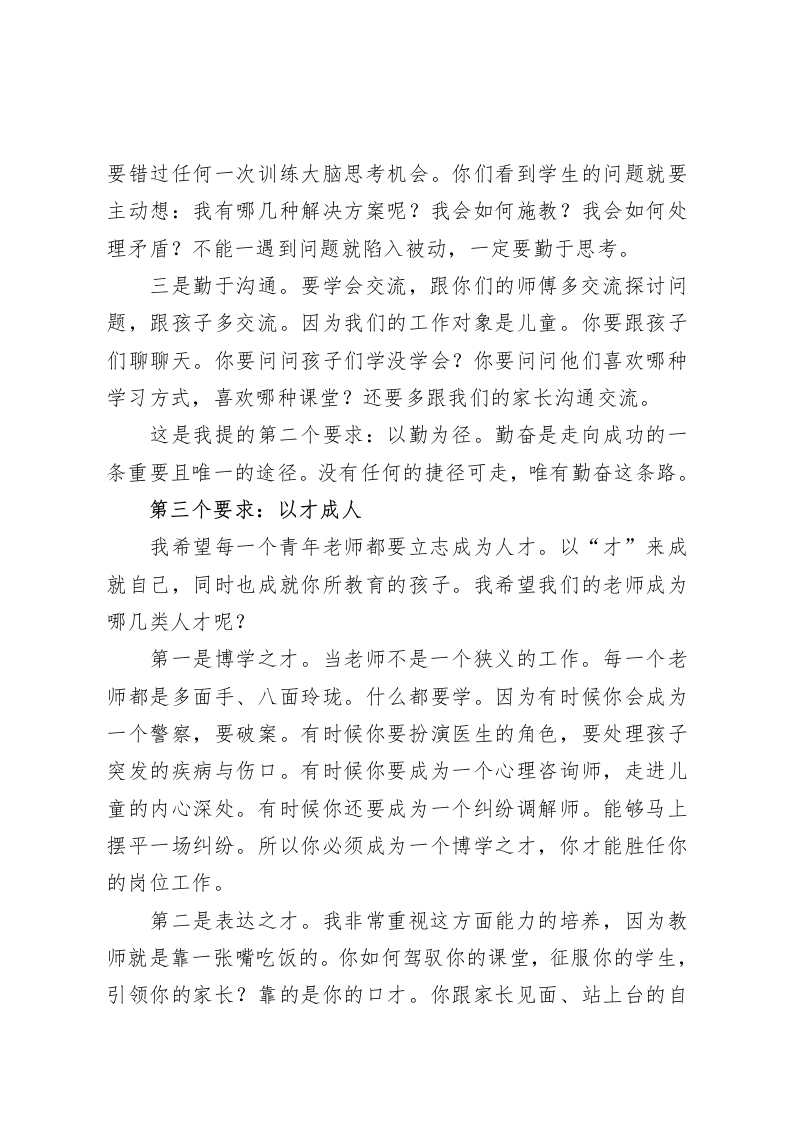 青年教师座谈会上,校长讲话引经据典,只有你享受教育,你才会不断投入,你才会不舍昼夜,孜孜以求各位青年教师:教育是一件幸福的事情。孟子说:人生有三乐。父母俱存,兄弟无故,一乐也。仰不愧于天,俯不怍于人,二乐也。得天下英才而教育之,三乐也。教师就是能“得天下英才而教育之。”所以我们应该把教育当成一件幸福的事业来追求。在今天的座谈会上,我想跟我们的青年老师提三个要求:第一个要求:以身作则要论以身作则的话,我们首先要做一个好人。什么样的人是好人呢?他有高尚的品格的、良好的素养、还要有温度、有责任感。其次,我们的身份是教师。“学高为师,身正为范。”我们当老师要有老师的形象气质;我们当老师要有当老师的人格魅力、综合素养。所以我们要有老师的样子。今天听大家上台讲话,我觉得都有老师的样子。除了对老师这个要求之外,以身作则还有一个更高的要求,就是这所学校的老师。这是一所名校,所以进入名校任教还不一样。因为你们头戴光环。大家都会对你们高看一眼,因为这里有标高,有品质。作为一名某某学校的教师,要更加严格要求自己,举手投足都是名校教师的风范气质与不凡人谈吐,任何场合能够侃侃而谈、落落大方、自信从容,要有这份底气。我们服务片区的