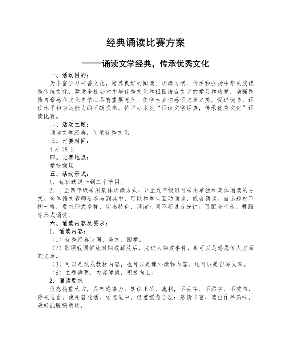 经典诵读比赛方案诵读文学经典,传承优秀文化一、活动目的:为丰富学习书香文化,培养良好的阅读、诵读习惯,传承和弘扬中华民族优秀传统文化,激发全社会对中华优秀文化和祖国语言文字的学习和热爱,增强民族自豪感和文化自信心具有重要意义。使学生真切感悟文章之美,促进读书、诵读水平和表达能力的不断提高,特举办本次“诵读文学经典,传承优秀文化”诵读比赛。二、活动主题:诵读文学经典,传承优秀文化三、比赛时间:4月18日四、比赛地点:学校操场五、活动形式:1.每班选送一到二个节目。2.一至四年级采用集体诵读方式,五至九年级班可采用单独和集体诵读的方式。全体语文教师要参与到其中,可以和学生互动诵读,或者领读。自选题材不拘一格,要求形式多样,突出特色,诵读时间不超过5分钟。可配合音乐、舞蹈等形式诵读。六、诵读内容及要求:1.诵读内容:(1)优秀经典诗词、美文、国学。(2)歌颂我国解放时期或解放后,先进人物或事件,也可以是感恩他人方面的文章。(3)可以是现成教材内容,也可以是课外读物内容,还可以是自写文章。(6)主题鲜明,内容健康,积极向上。2.诵读要求仪态稳重大方,具有感染力;朗读正确、流利,不丢字、不添字、不破句,停顿适当,使用普通活,语速适中,轻重缓急合理;感情丰富,读出作品韵味。最好能脱稿朗诵。