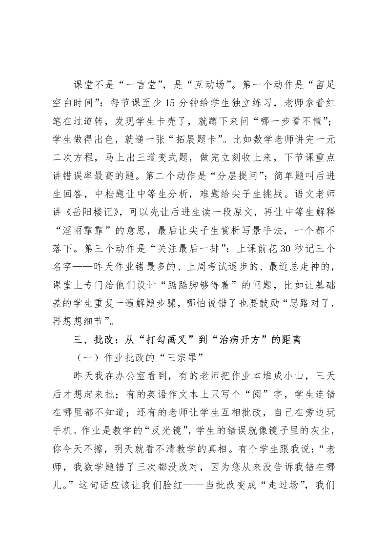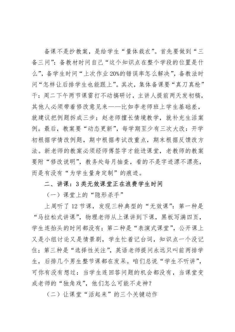 全体教师大会上,副校长讲话:警惕!7个教学环节正在吞噬课堂质量—一从备课到教研的破局之道各位同事:大家好!今天咱们不念文件、不走过场,就聊点实在的一一上周教学督导发现,全校237名教师中,能完整落实教学七环节的不足40%。有老师说“学生基础差,怎么教都没用”,可为什么同样的生源,有的班级平均分能高出20分?问题到底出在哪?今天我要掏心窝子说句实话:毁掉教学质量的从来不是学生,而是我们对“备讲批辅考评研”这7个环节的敷衍应付。这7个环节就像7块拼图,少一块不成形,松一块就散架。咱们今天逐个拆解,看看怎么把这副“教学拼图”拼完整、拼扎实。一、备课:3个误区让80%的教案成了废纸(一)当前备课的三大“致命伤”每天早上7点50分,我在教学楼转一圈,总能看到有些老师在教室门口翻教案、抄课件,这就是咱们常说的“十分钟备课”。现在备课有三个怪现象:一是网上下载的课件比自己写的还多,数学组张老师的教案里甚至还留着外校的班级名称;二是集体备课变成“茶话会”,主讲人念PPT,其他人刷手机,研讨记录全靠课后补;三是教案“十年如一日”,王老师教了15年语文,《背影》的教案还是刚入职时的版本,连例题都没换过。(二)让备课真正落地的四个“硬招”