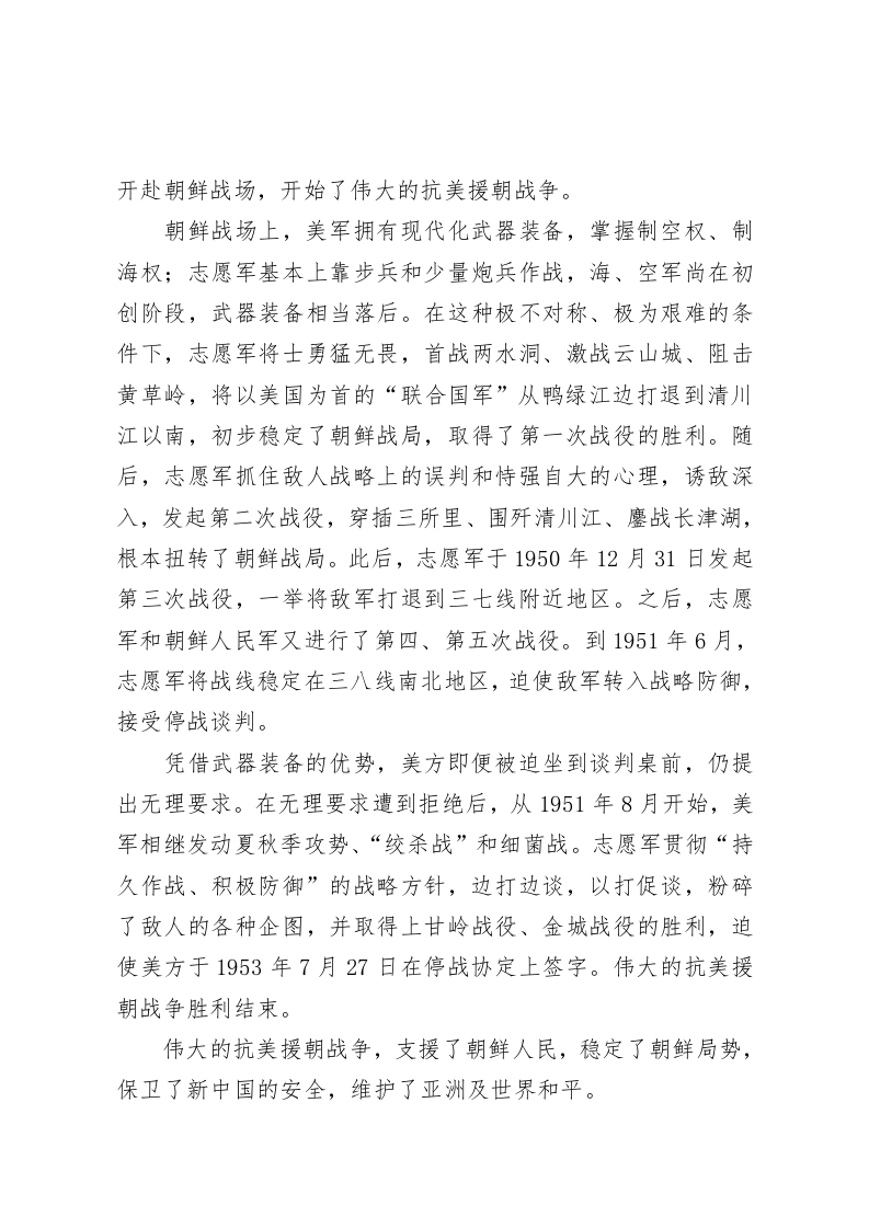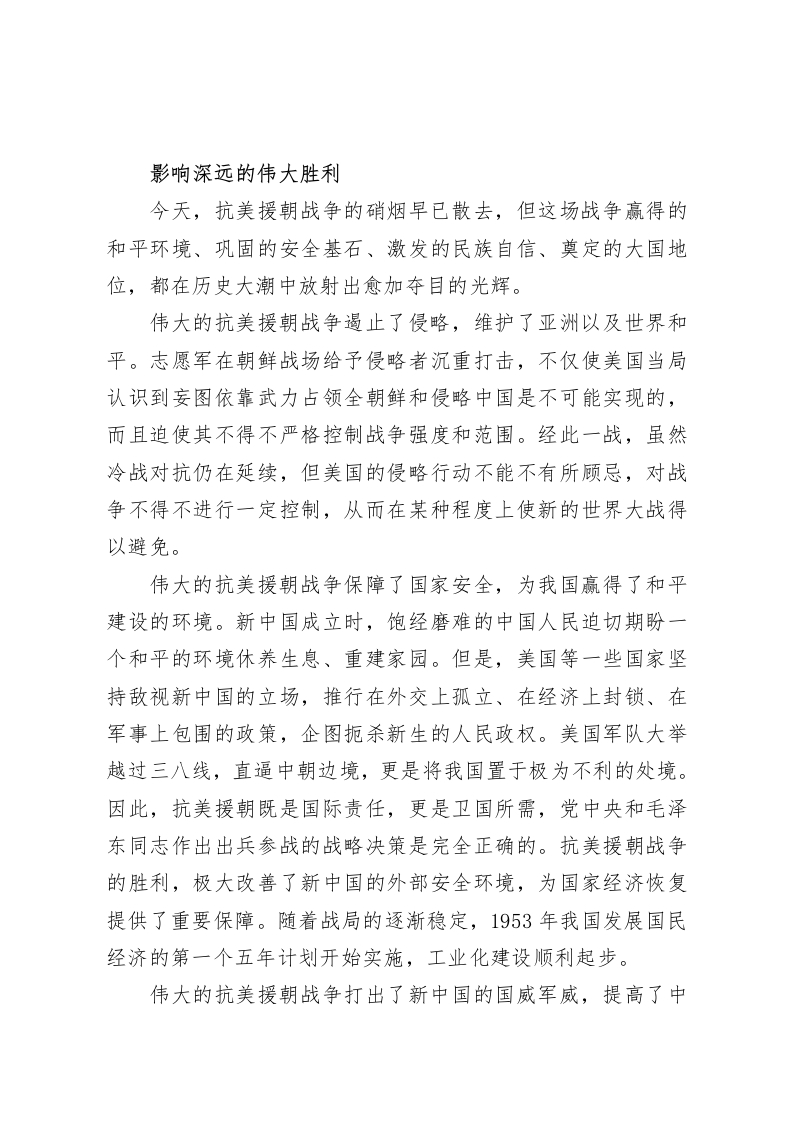 人民要论:光辉的篇章不朽的丰碑纪念中国人民志愿军抗美援朝出国作战75周年伟大的抗美援朝战争是中华民族历史上的一座不朽丰碑。这场战争所取得的胜利意义重大、影响深远。纪念中国人民志愿军抗美援朝出国作战75周年,要更加珍视抗美援朝战争留下的宝贵财富,使其成为我们开创美好未来的强大精神力量。习近平总书记在参观“铭记伟大胜利捍卫和平正义一一纪念中国人民志愿军抗美援朝出国作战75周年主题展览”时强调,75年前,为了保卫和平、反抗侵略,中国党和政府毅然作出抗美援朝、保家卫国的历史性决策,英雄的中国人民志愿军高举正义旗帜,同朝鲜人民和军队一道,舍生忘死、浴血奋战,赢得了抗美援朝战争伟大胜利,为世界和平和人类进步事业作出巨大贡献。伟大的抗美援朝战争,谱写了一曲可歌可泣的壮丽史诗,铸就了中华民族历史上又一座不朽丰碑。气吞山河的壮丽史诗正义必胜,是人类发展史反复验证的一个真理。朝鲜内战爆发后,美国派兵武装干涉,不顾中国政府多次警告,越过三八线,直逼中朝边境,并出动海军侵入台湾海峡,轰炸中国东北边境地区。面对美国的霸权挑衅,中国人民别无选择,只有奋起抗争。应朝鲜党和政府的请求,党中央和毛泽东同志经过艰难抉择,作出了抗美援朝、保家卫国的重大战略决策。1950年10月19日,中国人民志愿军雄赳赳、气昂昂,跨过鸭绿江,