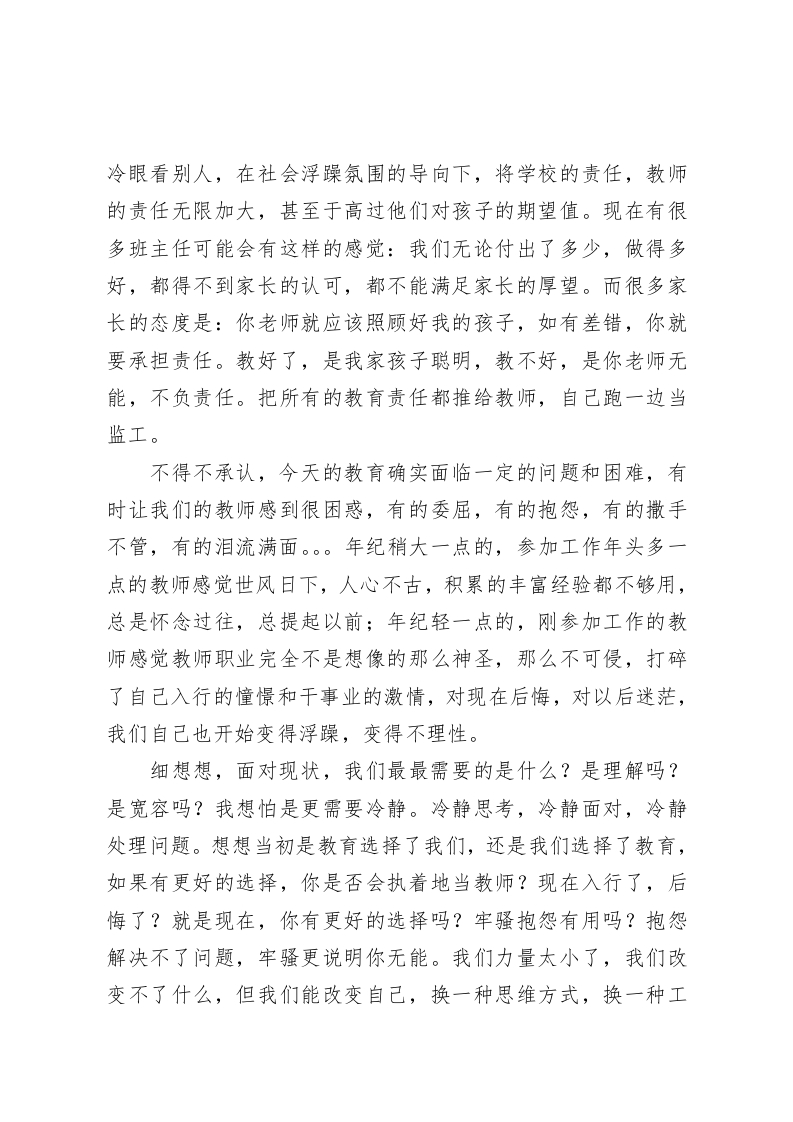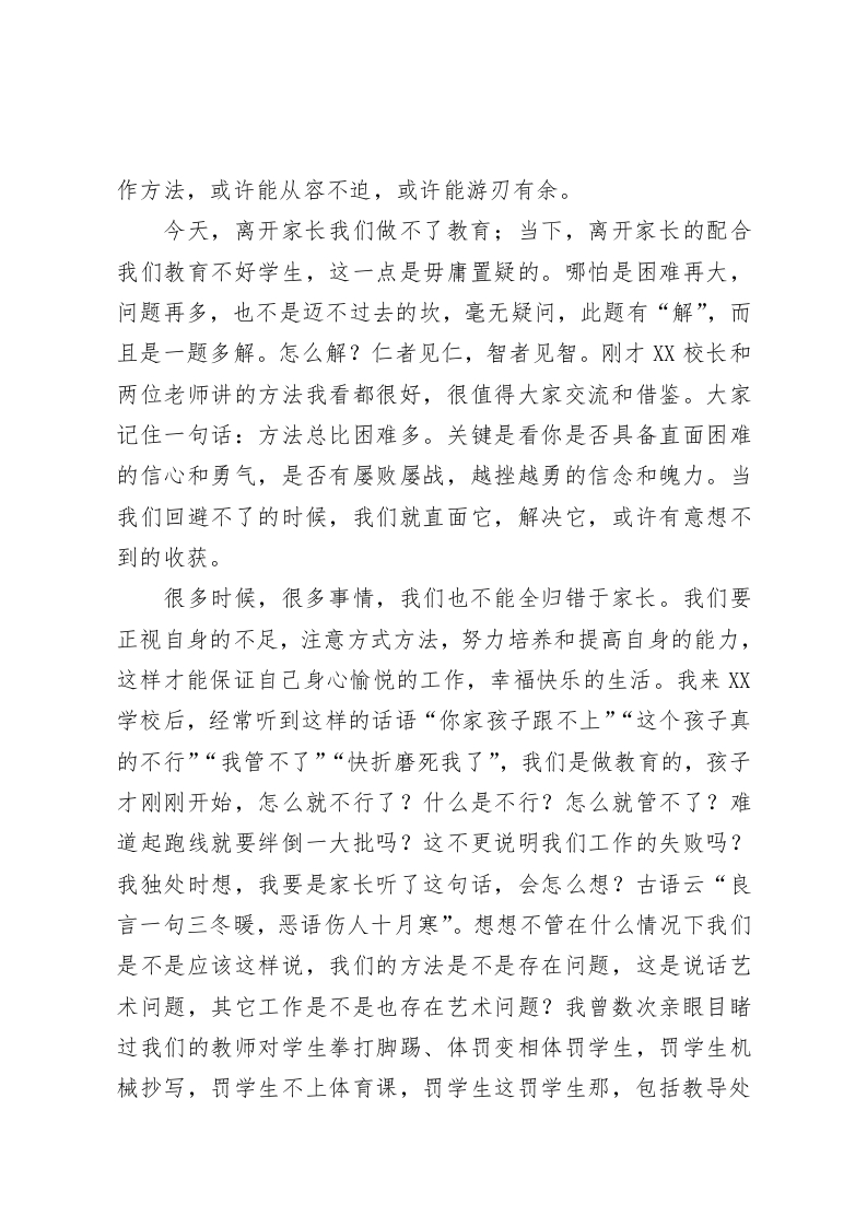 如何做好家长工作经验交流会上,校长讲话随着教育形势的发展,家庭教育、家长工作、家校共育成为影响我们提高教育教学质量的关键各位老师:大家下午好!今天我们在这里召开“如何做好家长工作”的经验交流会,我感觉很及时,很有必要。随着教育形势的发展,家庭教育、家长工作、家校共育的作用越来越突出,成为影响我们提高教育教学质量的关键。今天,我们一起聆听了x校长关于“当前班主任如何做好家长工作”的培训讲座,又听取了XX老师、XXX老师两位优秀班主任的经验介绍,回顾我们以往的工作,我想,大家一定和我一样有所感悟。为什么要做好家长工作?怎么样才能做好家长工作?刚才XX校长和两位班主任都已经讲得很全面、很透彻了,我在这里不再罗嗦。我就站在一个普通教育者的角度,结合我的感受,随意谈一下自己的一些想法。“有什么样的家长,就有什么样的孩子”越来越成为我们教育工作者的共识。孩子就是我们了解家长的一面镜子,就教育而言,家长才是第一教育者、主要教育者,是“主科”,我们都是“副科”。而现实情况是,我们的家长来自于社会的各行各业,文化水平、性格取向、自身素质千差万别,有的过于溺爱,有的无暇顾及,但这些家长本身无视,从不正眼看自己,总是