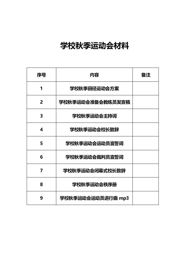 学校秋季运动会材料序号内容备注1学校秋季田径运动会方案2学校秋季运动会准备会教练员发言稿3学校秋季运动会主持词4学校秋季运动会校长致辞5学校秋季运动会运动员宣誓词6学校秋季运动会裁判员宣誓词7学校秋季运动会闭幕式校长致辞8学校秋季运动会秩序册9学校秋季运动会运动员进行曲mp3