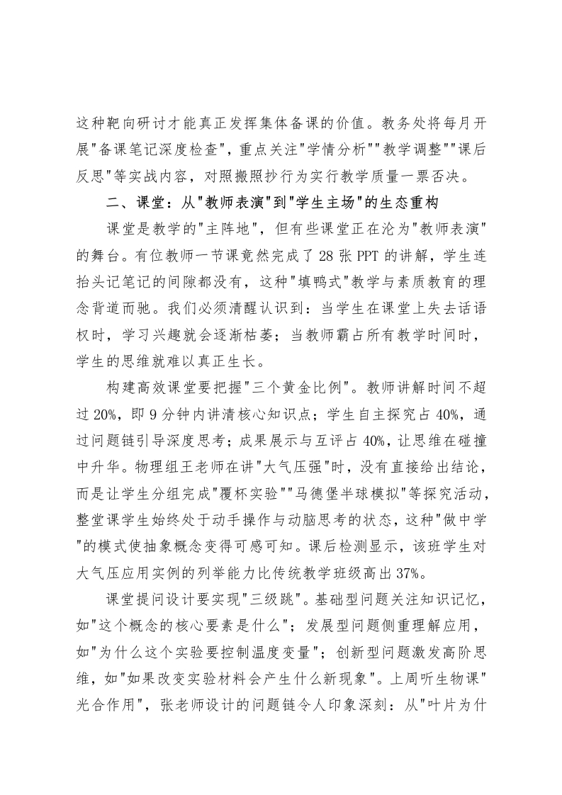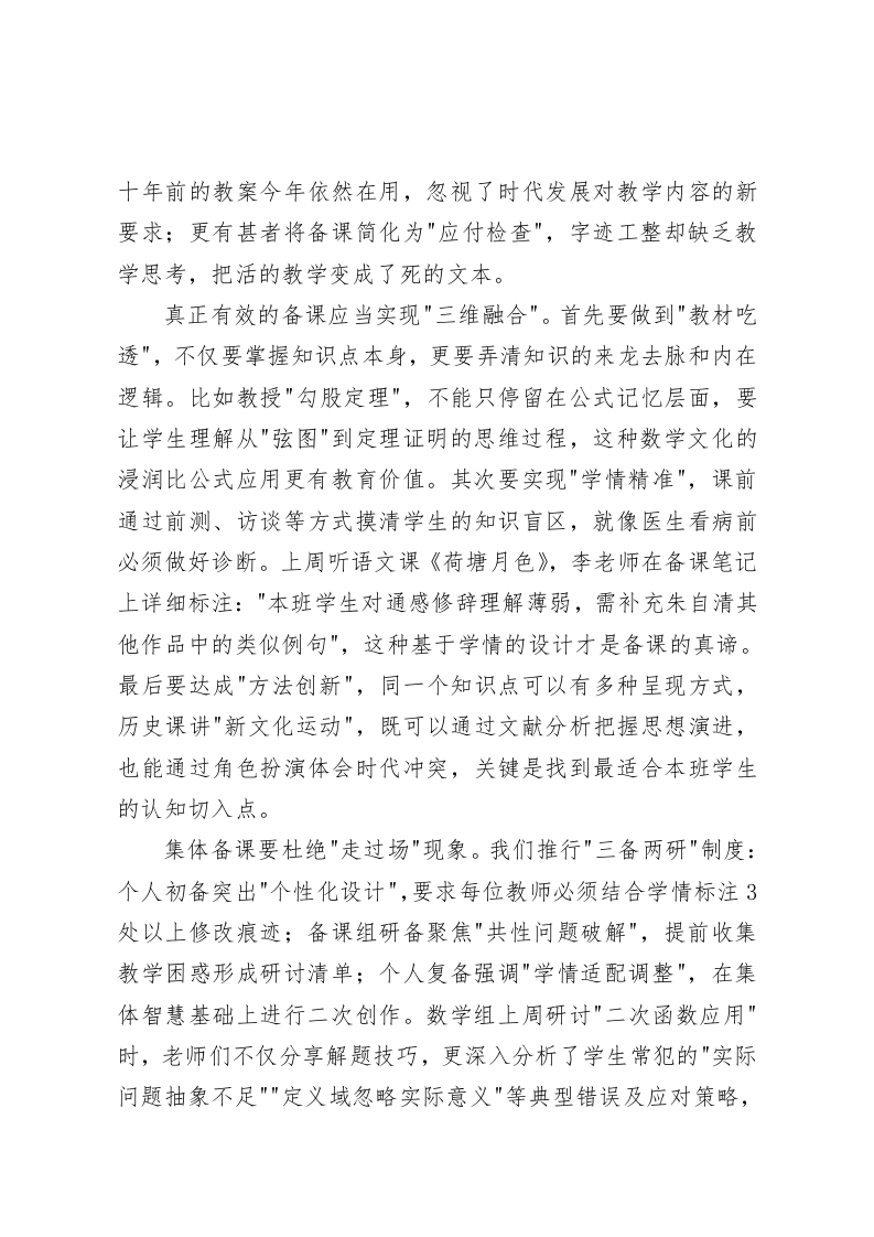 校长在全体教师大会上的讲话:褪去浮华守初心,深耕课堂育桃李各位同仁:大家好!今天我们齐聚一堂,共同探讨一个永恒的教育命题一一如何让我们的课堂真正焕发生命力。近期教务处组织了一次"推门听课"活动,发现了一个值得深思的现象:有的课堂课件精美如电影大片,环节设计如综艺晚会,但学生课后却连最基础的知识点都说不完整;有的教师教案写得工工整整,教学环节滴水不漏,可学生的眼神里却缺少应有的光彩。这些现象背后,折射出我们在追求教学形式创新的同时,可能正在失教育最本真的东西。教育是一门慢艺术,需要深耕细作的耐心:教学是一场修行,需要返璞归真的定力。今天我想和大家重点交流七个方面的问题,这些问题既是我们日常教学的"基本功”,更是决定教学质量的"压舱石”。唯有把这些基础工作做扎实、做精细、做出温度,才能让教育的种子在学生心中生根发芽,长成参天大树。一、备课:从"教案编写"到"教学预案"的思维转型备课是教学的"第一粒扣子”,扣错了方向,整堂课都会偏离轨道。当前我们的备课存在三种值得警惕的倾向:有的教师把备课异化为"资料搬运",从网络下载教案稍作修改便走进课堂,全然不顾本班学生的认知特点;有的满足于"经验复制”,