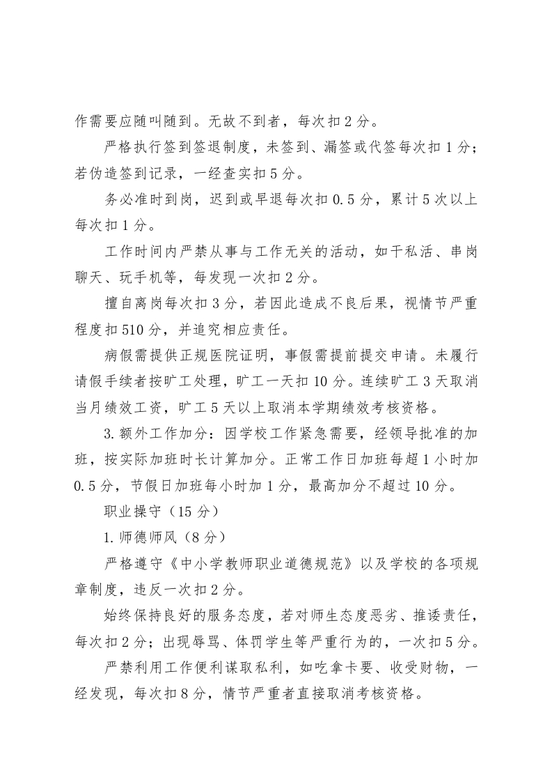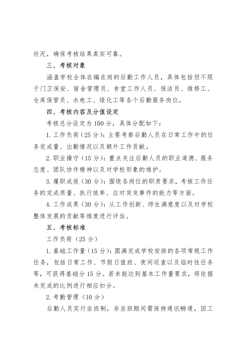 学校后勤工作人员绩效工资考核方案(2025年)一、指导方针秉持[具体指导理念]的引领,将其融入学校后勤管理工作的每一个环节。通过构建科学有效的考核体系,全面激发后勤人员的工作热情与创造力,推动学校各项事业稳健前行,营造优质和谐的校园环境,为师生提供坚实可靠的后勤保障服务。二、考核准则1.按劳分配、优绩优酬:充分尊重后勤人员的劳动付出,依据工作强度、质量和成果,合理分配薪酬与奖励。多劳者多得实惠,优劳者收获厚报,杜绝平均主义,切实增强后勤人员的工作责任感和使命感。2.公开透明、公平公正:从考核标准的制定、考核程序的执行到考核结果的公布,全程保持公开透明,主动接受全体师生的监督。确保考核过程无偏私、无舞弊,以客观公正的态度评价每一位后勤人员的工作表现。3.以人为本、激励共进:高度重视后勤人员的劳动成果,关注他们的实际需求和切身利益。通过考核机制,不仅对优秀人员给予肯定和激励,更要带动全体后勤人员共同进步,提升整体队伍素质。4.定量定性结合:在考核过程中,既注重可量化的数据指标,如工作量、工作效率等,又兼顾难以量化的工作态度、服务质量等方面的综合评价。全面、客观地考量后勤人员的工作