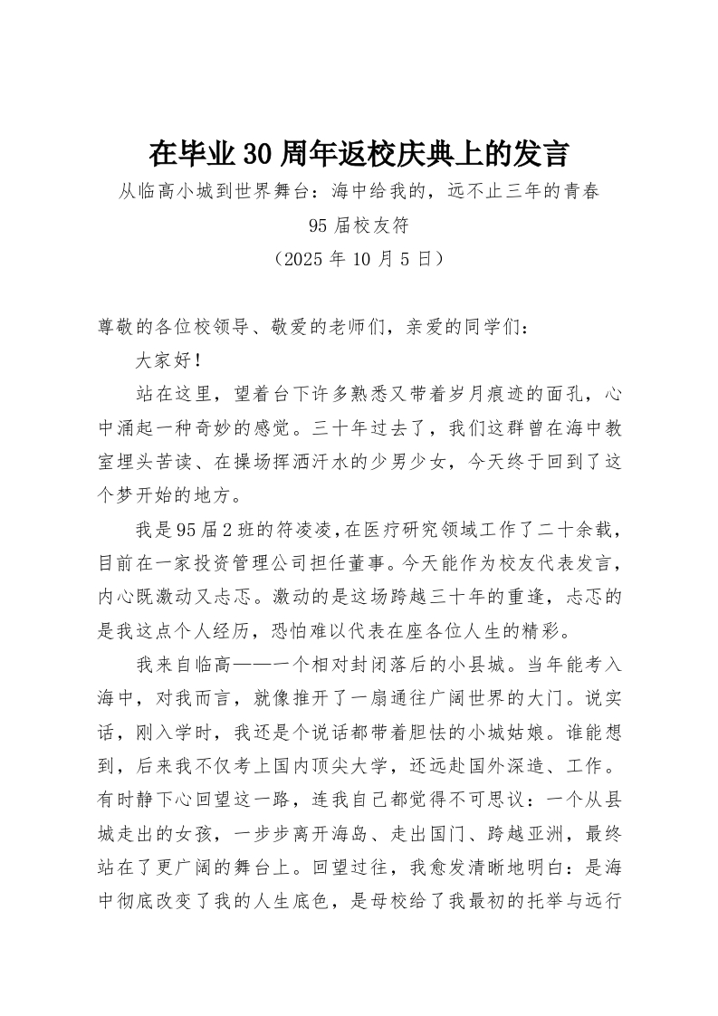 在毕业30周年返校庆典上的发言从临高小城到世界舞台:海中给我的,远不止三年的青春95届校友符(2025年10月5日)尊敬的各位校领导、敬爱的老师们,亲爱的同学们:大家好!站在这里,望着台下许多熟悉又带着岁月痕迹的面孔,心中涌起一种奇妙的感觉。三十年过去了,我们这群曾在海中教室埋头苦读、在操场挥洒汗水的少男少女,今天终于回到了这个梦开始的地方。我是95届2班的符凌凌,在医疗研究领域工作了二十余载,目前在一家投资管理公司担任董事。今天能作为校友代表发言,内心既激动又忐忑。激动的是这场跨越三十年的重逢,忐忑的是我这点个人经历,恐怕难以代表在座各位人生的精彩。我来自临高一一一个相对封闭落后的小县城。当年能考入海中,对我而言,就像推开了一扇通往广阔世界的大门。说实话,刚入学时,我还是个说话都带着胆怯的小城姑娘。谁能想到,后来我不仅考上国内顶尖大学,还远赴国外深造、工作。有时静下心回望这一路,连我自己都觉得不可思议:一个从县城走出的女孩,一步步离开海岛、走出国门、跨越亚洲,最终站在了更广阔的舞台上。回望过往,我愈发清晰地明白:是海中彻底改变了我的人生底色,是母校给了我最初的托举与远行