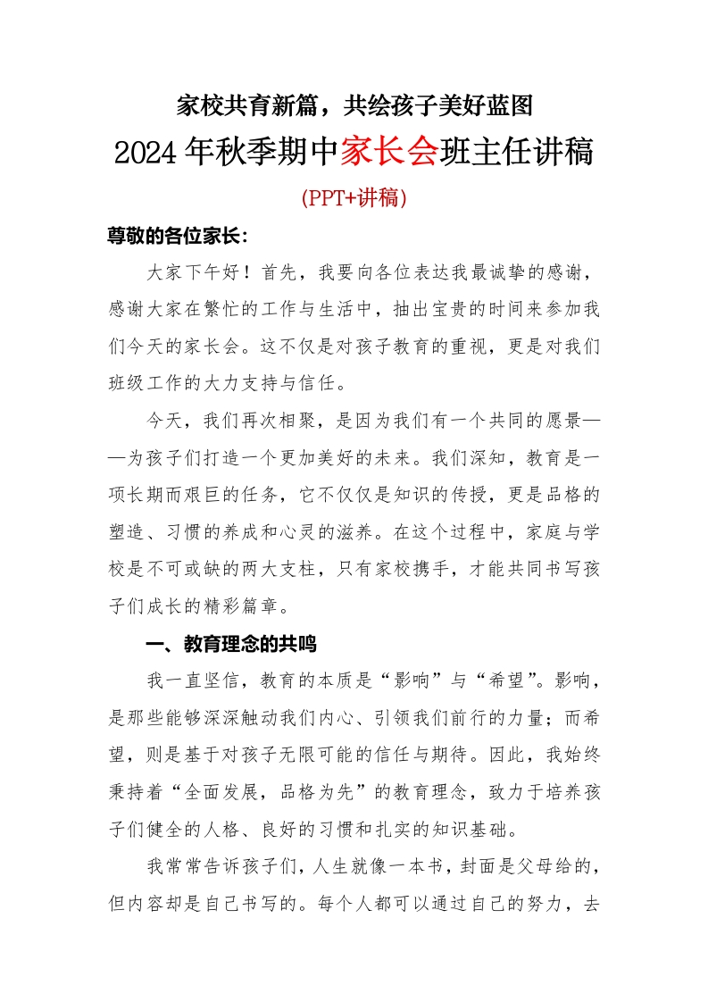 家校共育新篇,共绘孩子美好蓝图2024年秋季期中家长会班主任讲稿(PPT+讲稿)尊敬的各位家长:大家下午好!首先,我要向各位表达我最诚挚的感谢,感谢大家在繁忙的工作与生活中,抽出宝贵的时间来参加我们今天的家长会。这不仅是对孩子教育的重视,更是对我们班级工作的大力支持与信任。今天,我们再次相聚,是因为我们有一个共同的愿景一一为孩子们打造一个更加美好的未来。我们深知,教育是一项长期而艰巨的任务,它不仅仅是知识的传授,更是品格的塑造、习惯的养成和心灵的滋养。在这个过程中,家庭与学校是不可或缺的两大支柱,只有家校携手,才能共同书写孩子们成长的精彩篇章。一、教育理念的共鸣我一直坚信,教育的本质是“影响”与“希望”。影响,是那些能够深深触动我们内心、引领我们前行的力量:而希望,则是基于对孩子无限可能的信任与期待。因此,我始终秉持着“全面发展,品格为先”的教育理念,致力于培养孩子们健全的人格、良好的习惯和扎实的知识基础。我常常告诉孩子们,人生就像一本书,封面是父母给的,但内容却是自己书写的。每个人都可以通过自己的努力,去