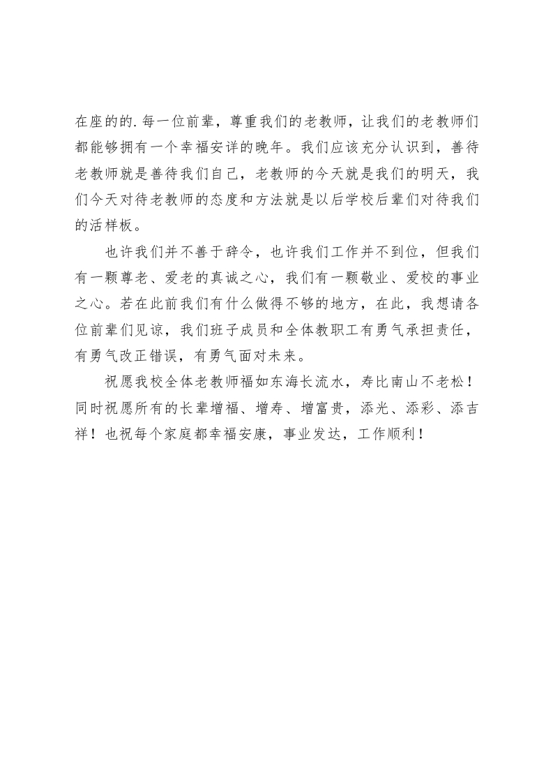 重阳节教师座谈会上,校长发言家家有老人,人人都会老尊敬的各位前辈:岁岁重阳,今又重阳。记得去年xx月Xx日,我们在这儿庆祝“九九”重阳节。今年,在老人节到来之际,我们重新相聚在这里,我代表学校向尊敬的老教师们表示最热烈的节日祝贺!祝你们福如东海,寿比南山,合家欢乐!2025,我校是捷报频传:首先我校2025年高考取得了决定性特大丰收,一二本上线再次突破百人大关;其次,我校市级示范学校申报圆满成功;另外,我校的各项工作都进入全县先进行列,最近的老年人门球赛一举夺冠。我校所取得的这些成绩,无不是您当年工作成绩的积累,无不是您发挥余热的成果,所以我们可以自豪的说:xx学校的一草一木都凝聚着每一位前辈的辛勤的汗水!Xx学校的每一个微小的和突破性的进步都写下了各位前辈的无限荣光!总之,我们学校的发展,渗透了老一辈教育工作者的汗水和心血,离不开老一辈教育工作者的辛勤探索和奉献。学校的生存与发展,与大家休戚相关、荣辱与共。所以希望诸位今后一如既往,发挥余热,为学校发展献计献策,给我们的工作多提宝贵意见。家家有老人,人人都会老,无论是从亲情伦理的角度讲还是从道德法律的角度讲,无论从曾经为教育事业所作的贡献还是从现在仍为学校发余热来说,我们都应该义不容辞地去善待