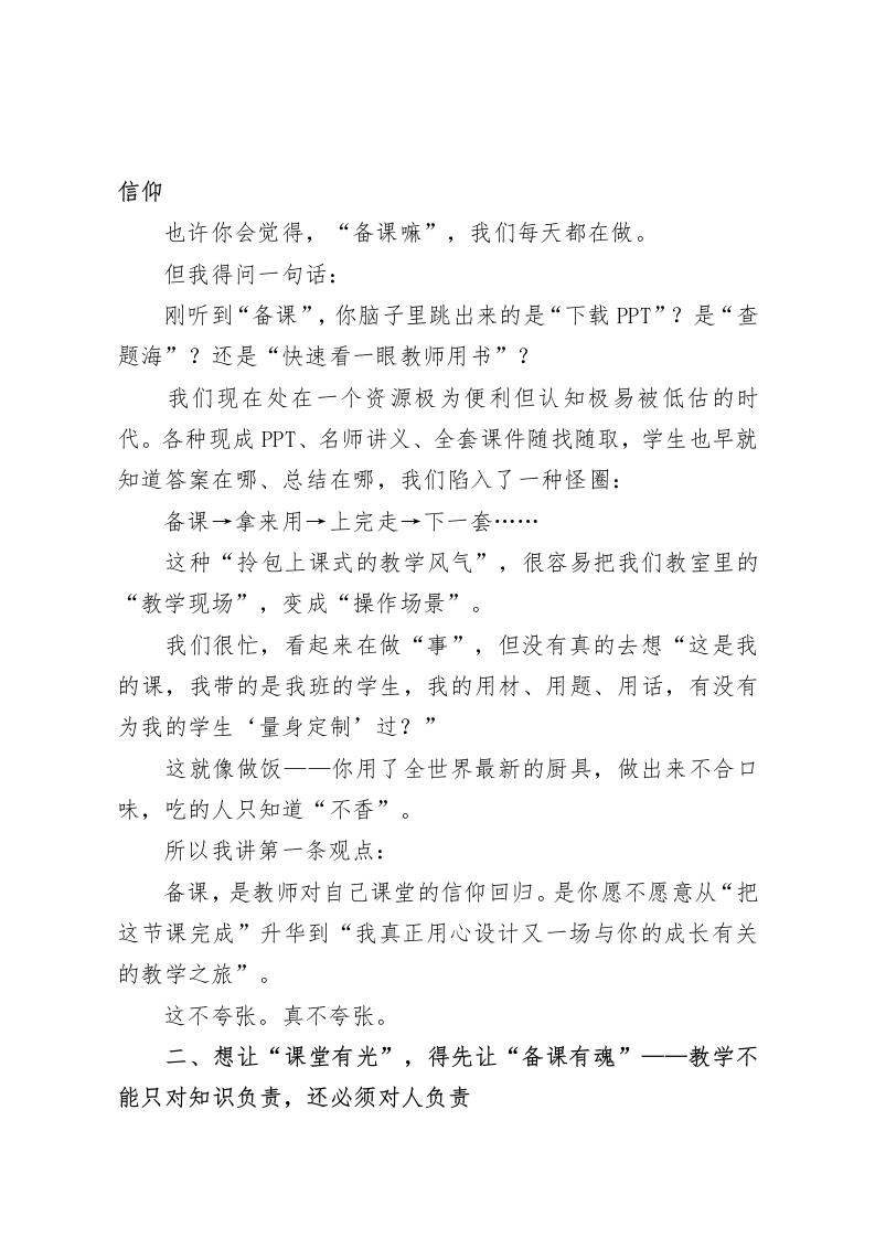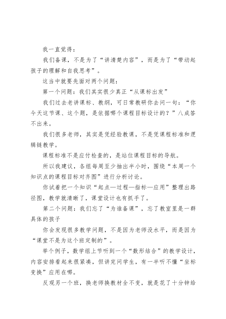 备课组长会议校长讲话:如果备课只是抄教案、套模板,这样的教学是走不远的!各位老师、亲爱的备课组长们:大家下午好!今天我们专门把各教研组的组长请过来坐在一起办这个会,一方面是例行工作汇报需要,一方面也是真心想找个更静下来的时间,和大家聊一聊我们最基本、最日常、但又最关键的那件事:备课。说实话,这几周我也趁着空余时间去四十几节课听了一拍,一边听课,一边反思,也一边对我们老师的课堂状态、教学姿态、备课素材做了不少记录。让我特别感动的,是有些老师站在讲台上,能把一则枯燥的文言文扩展出一节灵魂舞蹈般的语文表达课;也有老师用一道导数题,给学生理出三个建模逻辑版本,引导全班进入“应用数学”的真实世界。但我也始终有个问题嘀咕在心里:我们每节精彩的课堂背后,到底得靠多少结构性的备课力量去托?那个支撑点一一是不是完全牢靠了?所以我今天想很诚恳地,就“备课”这一件事,跟大家深地掰开聊一聊。不讲大话,不干评价式说教,就咱们身在教学中这一线人,实实在在地聊聊成长、职责、方法与目标。一、别让“备课”变成一种流程模仿,它本质是一种教学