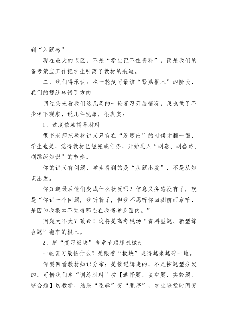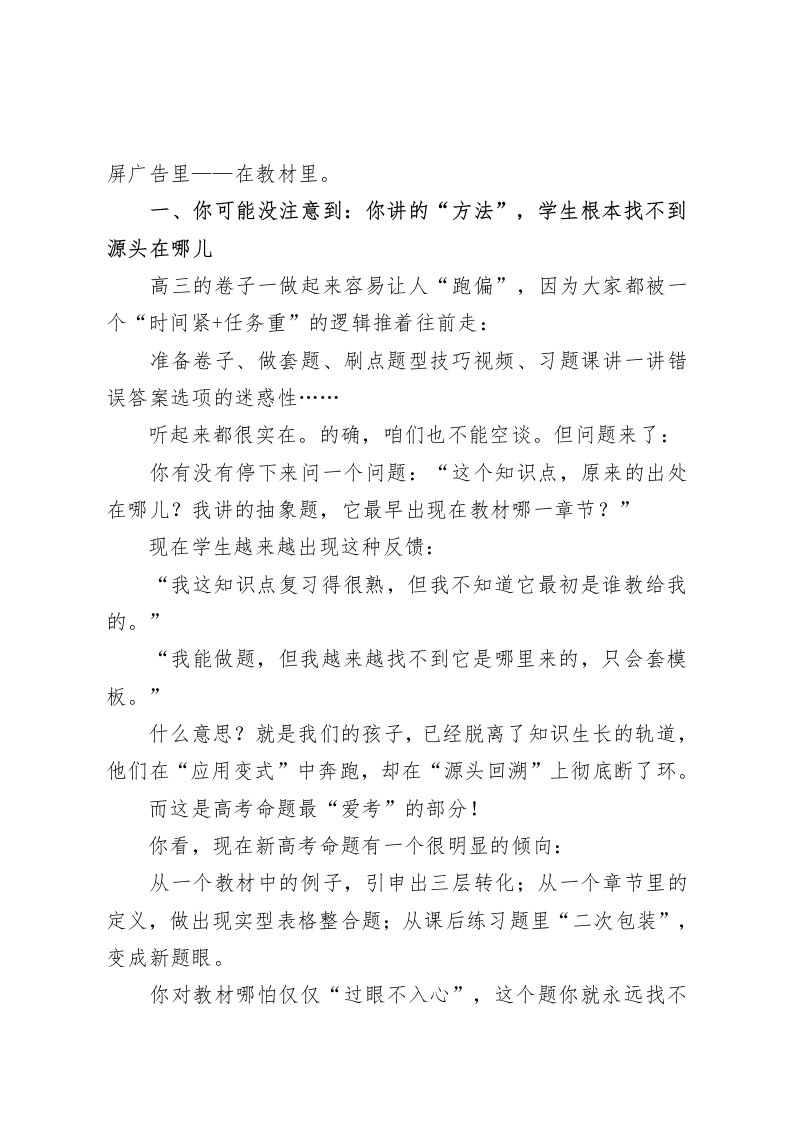 高三毕业班教师会上,副校长讲话:强调备考要“三度回归”:教材、课本、基础!各位高三老师:下午好!今天把大家集中起来,不发稿子,不念总结,就是咱们坐下来好好说说事,讲一讲最近复习里我最担忧也是最迫切需要大家一起统一认识的一个事情:你带的那帮学生,他们离教材已经太远了。上周跟着几位年级组长去参加了市里的高三备考研讨会,一圈听下来,几乎每位领域专家不约而同提到的,高频、强音就是一一回归教材,从头梳理,不要被辅导资料带歪了方向。走出会议室,我心头第一个想法就是:我们现在高三的一轮复习,到底还剩多少人肯扎进教材?我们的复习课,是不是成了“题目堆套路”?我们的讲解,是不是已经脱离了“知识出处”而只追“技巧快解”?我们的复习线,是按考试卷的顺序走,还是从课程标准的结构逻辑走?我今天讲这些,不是挑问题,而是想提醒大家:高考不是选谁会写卷子写得快,它选的是谁守住了知识的逻辑根基,还能把这个逻辑灵活应用。这个根基在哪?不在模拟题里,不在密卷里,不在机构刷