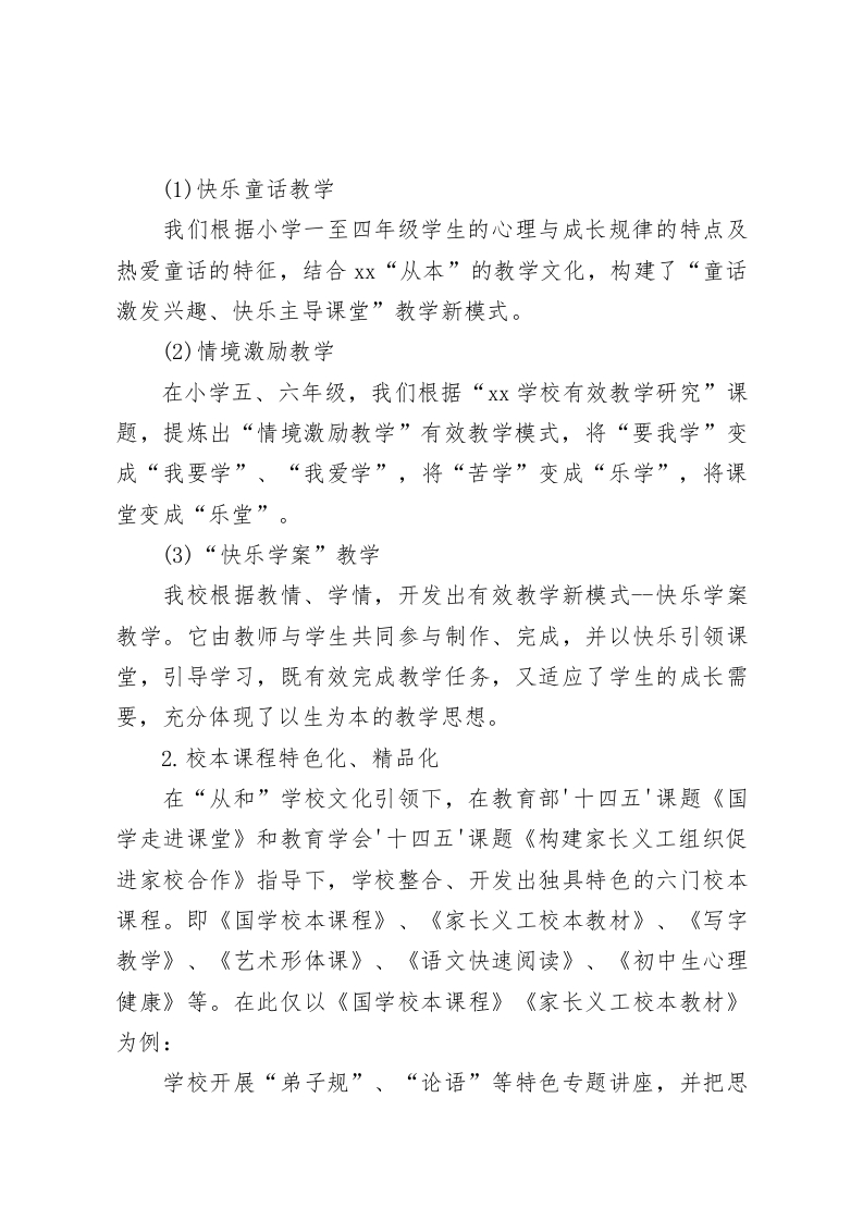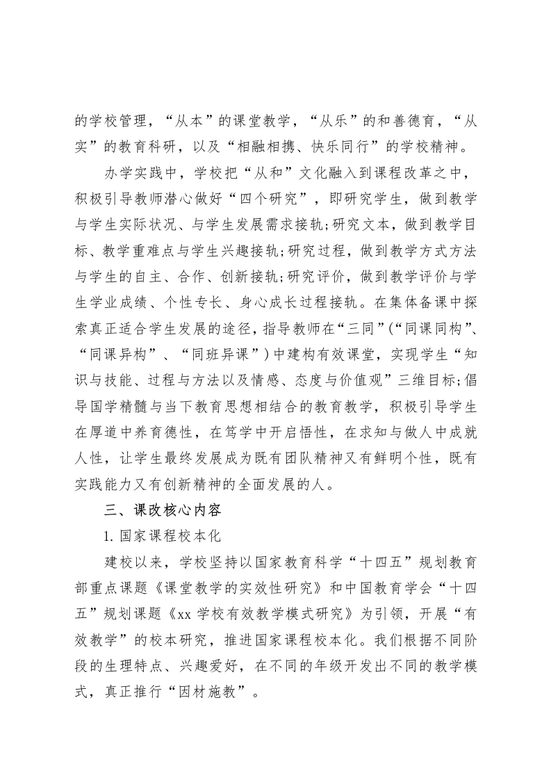 课程改革特色学校复评,校长汇报发言文化引领课改,科研成就品牌各位评委、专家,各位教育同仁:下午好!十分荣幸在此接受课程改革特色学校复评,谢谢各位评委,你们辛苦了!一、课改背景xx学校创建于20xx年8月,是九年一贯制公办学校,现有小学27个班,初中11个班,学生余人,专任教师113人。学校开办以来,始终坚持社会主义核心价值观,全面贯彻党的教育方针,全面实施素质教育,努力构建和谐教育,坚持以人为本,在尊重生命、尊重个性基础上,把课程改革作为办学重要抓手,把课堂作为第一观测站,紧紧围绕教育教学、围绕学生成长进行课程改革,开设出一系列适合学生心理特点、个性专长和成长需求的校本课程,实现了国家课程校本化,校本课程特色化、精品化。二、课改理念:“从和”文化引领课程改革,教育科研指导课改实践学校办学之初就制定出“文化引领办学,特色成就品牌”发展规划,并在此基础上,遵循当代教育教学规律,遵循学生成长规律,同时借鉴传统文化精髓,提出“厚道笃学,和而不同”的办学思想,构建出“从和”的学校文化:包括“从心”