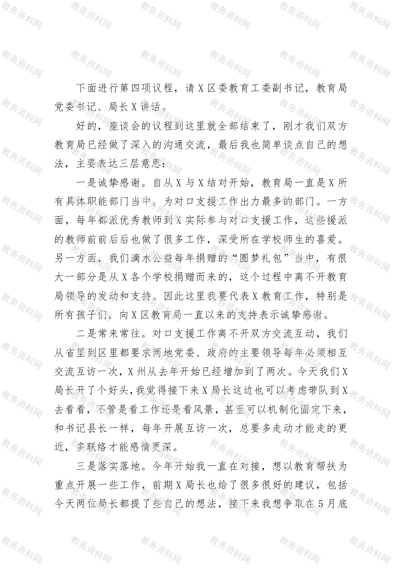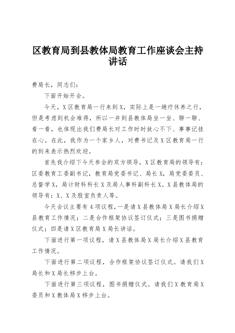 区教育局到县教体局教育工作座谈会主持讲话费局长,同志们:下面开始开会。今天,X区教育局一行来到X,实际上是一趟疗休养之行,但是考虑到机会难得,所以一并到县教体局坐一坐、聊一聊、看一看,也体现出我们费局长对工作时时放心不下、事事记挂在心。在此,我作为一个家乡人,对费书记及X区教育局一行的到来表示热烈欢迎。首先我介绍下今天参会的双方领导,X区教育局的领导有:区委教育工委副书记,教育局党委书记、局长X,局党委委员、总督学X,局计财科科长X及局人事科副科长X。X县教体局的领导有:X、X及股室负责人等。今天会议主要有4项议程,一是请X县教体局X局长介绍X县教育工作情况;二是合作框架协议签订仪式;三是图书捐赠仪式;四是请X区教育局X局长讲话。下面进行第一项议程,请X县教体局X局长介绍X县教育工作情况。下面进行第二项议程,合作框架协议签订仪式。请我们X局长和X局长移步上台。下面进行第三项议程,图书捐赠仪式。请我们X教育局X委员和X教体局X移步上台。