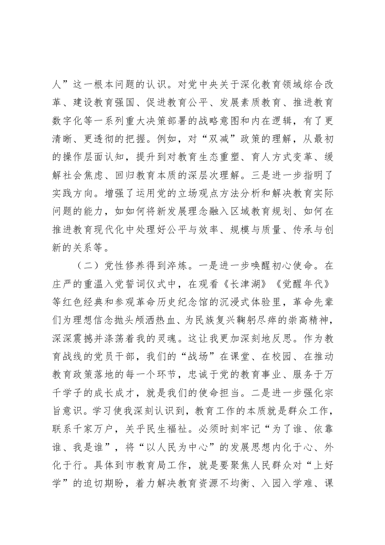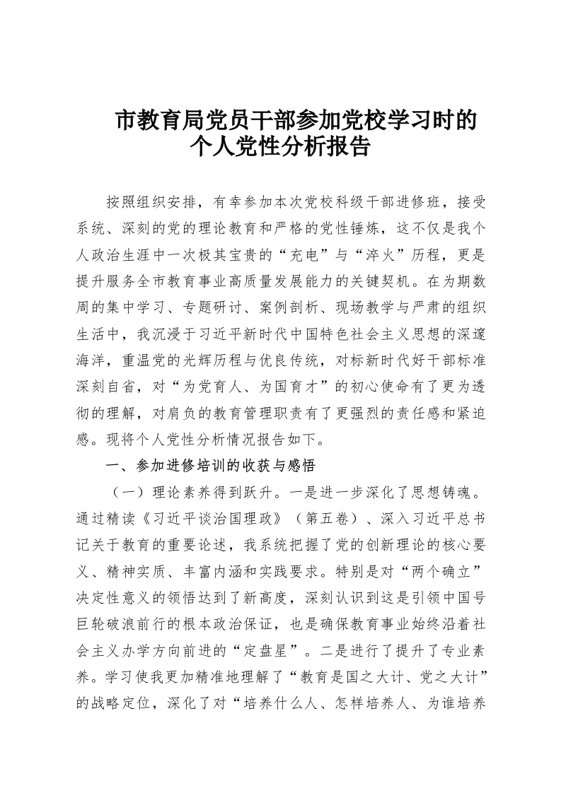 市教育局党员干部参加党校学习时的个人党性分析报告按照组织安排,有幸参加本次党校科级干部进修班,接受系统、深刻的党的理论教育和严格的党性锤炼,这不仅是我个人政治生涯中一次极其宝贵的“充电”与“淬火”历程,更是提升服务全市教育事业高质量发展能力的关键契机。在为期数周的集中学习、专题研讨、案例剖析、现场教学与严肃的组织生活中,我沉浸于习近平新时代中国特色社会主义思想的深邃海洋,重温党的光辉历程与优良传统,对标新时代好干部标准深刻自省,对“为党育人、为国育才”的初心使命有了更为透彻的理解,对肩负的教育管理职责有了更强烈的责任感和紧迫感。现将个人党性分析情况报告如下。一、参加进修培训的收获与感悟(一)理论素养得到跃升。一是进一步深化了思想铸魂。通过精读《习近平谈治国理政》(第五卷)、深入习近平总书记关于教育的重要论述,我系统把握了党的创新理论的核心要义、精神实质、丰富内涵和实践要求。特别是对“两个确立”决定性意义的领悟达到了新高度,深刻认识到这是引领中国号巨轮破浪前行的根本政治保证,也是确保教育事业始终沿着社会主义办学方向前进的“定盘星”。二是进行了提升了专业素养。学习使我更加精准地理解了“教育是国之大计、党之大计”的战略定位,深化了对“培养什么人、怎样培养人、为谁培养